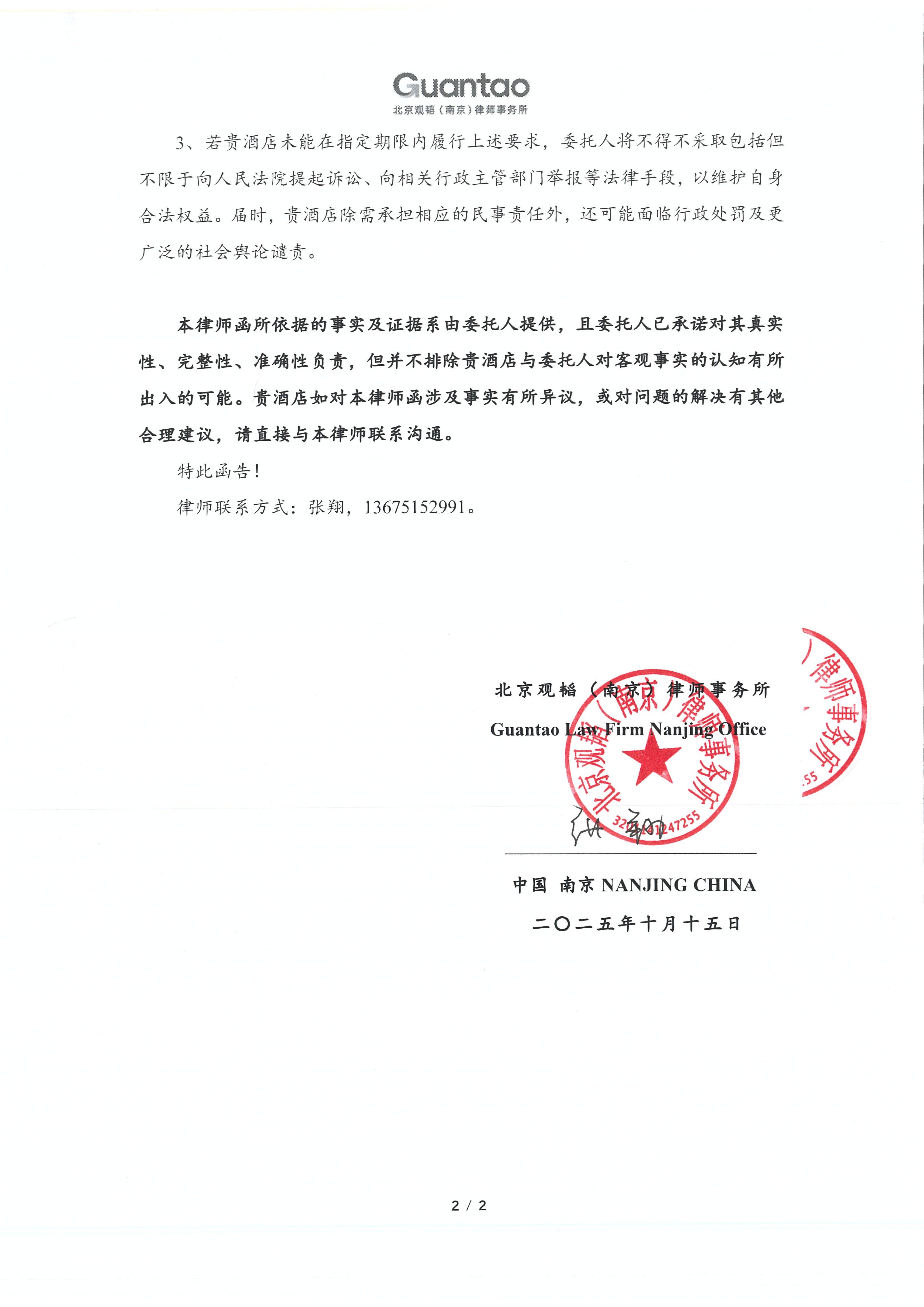 3. 若涉事酒店未在期限内履行上述要求,将采取诉讼等相关程序维护权益。