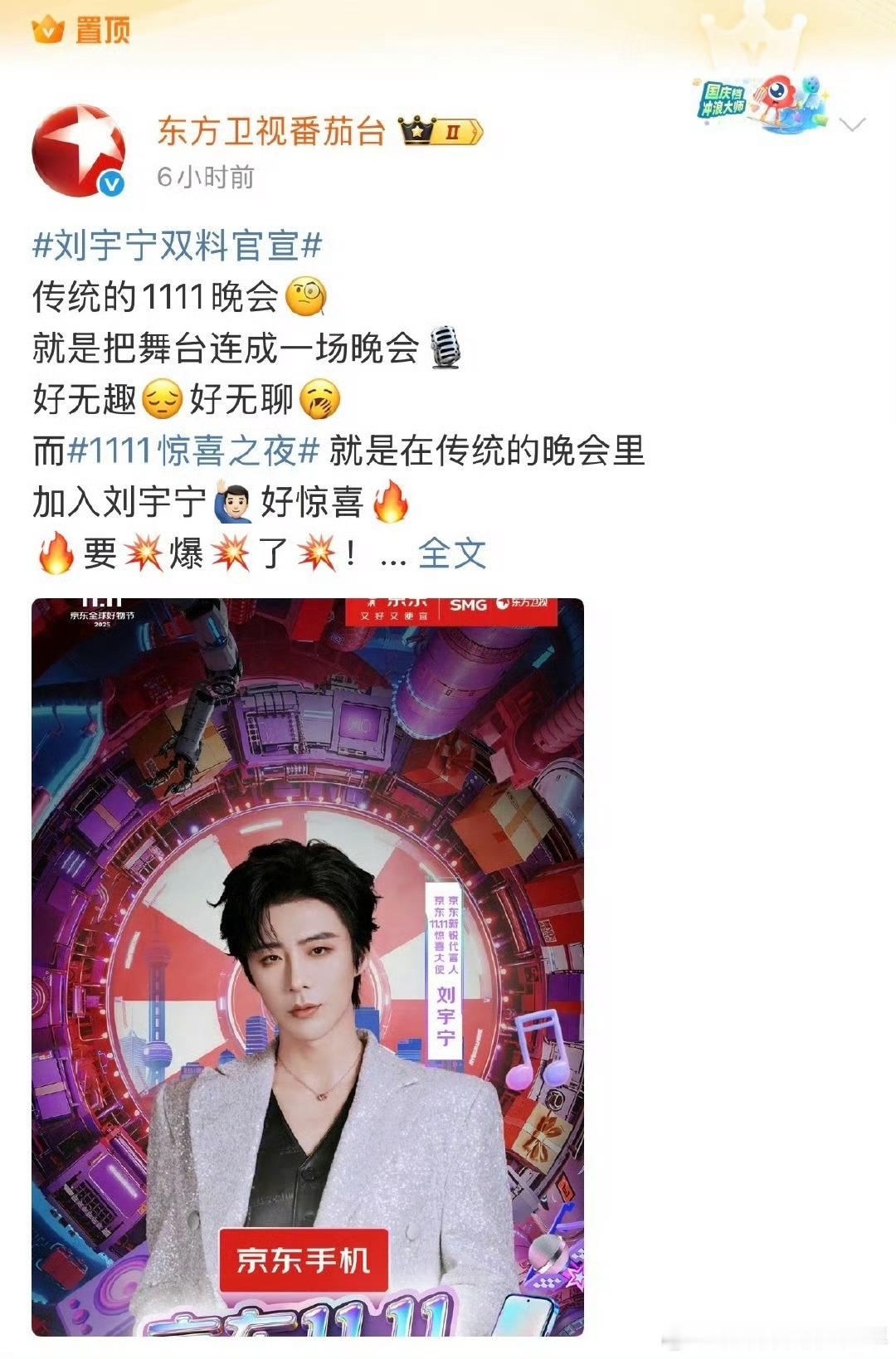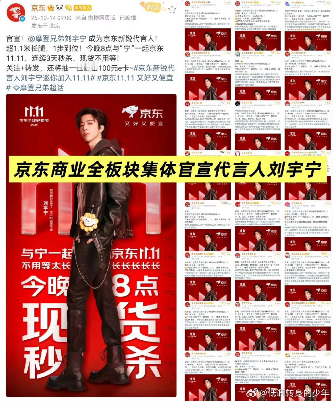 京东新锐代言人刘宇宁邀你加入11.11🎉 恭喜刘宇宁成为京东双十一代言人,直接解锁全平台顶级资源。京东双11晚会由东方卫视【唯一宣+首发宣+单独宣】,排面给足,全域矩阵强势推送! 刘宇宁[超话]