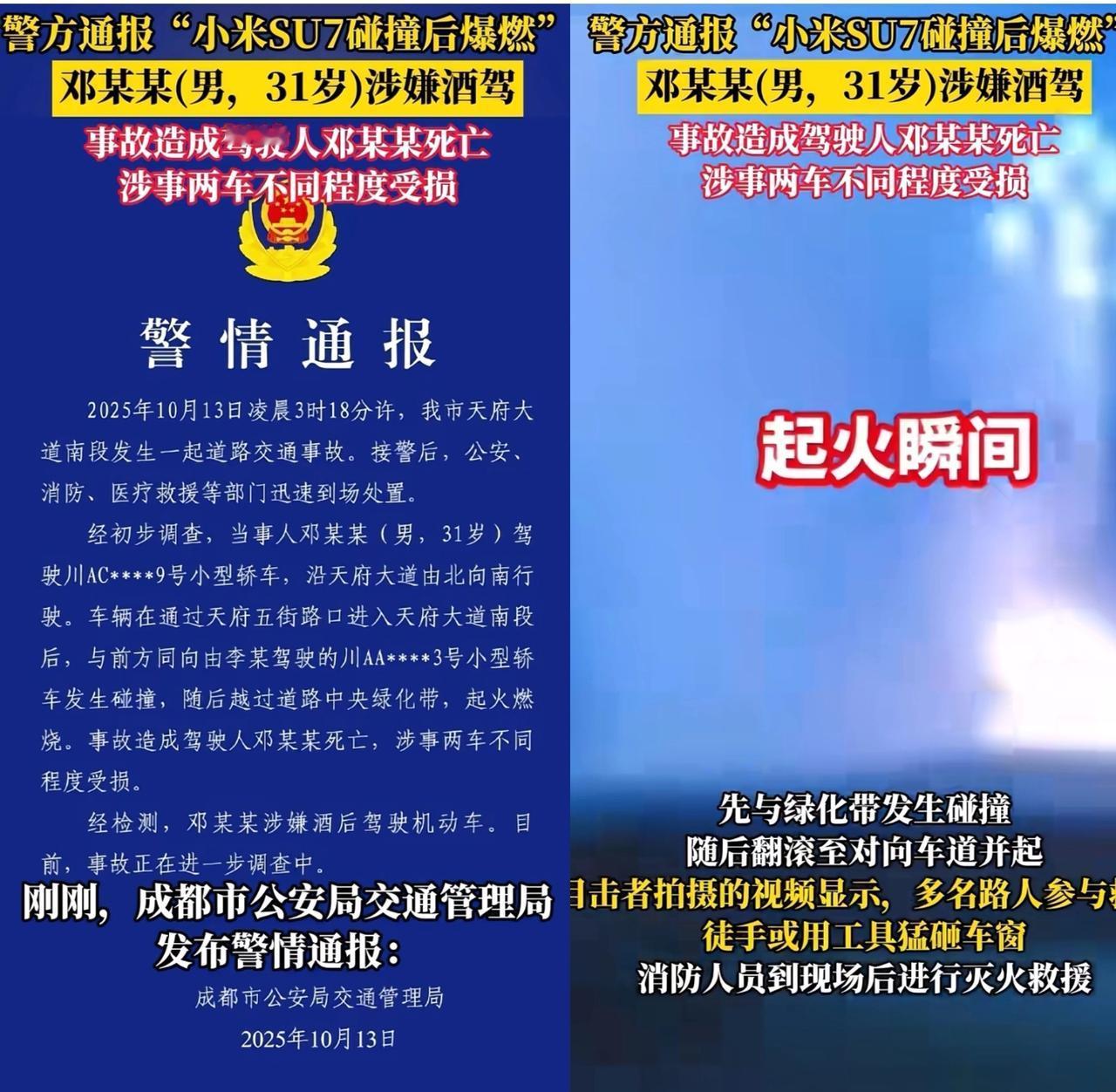成都小米 SU7Ultra车祸官方通报了, 是酒驾+超速, 导致车祸, 司机确认 死亡,看到车主被烧成骨架的照片,还是蛮恐怖的,当然也有可能是被撞死而不是被烧死。因为据目击者行车记录仪显示,事故车辆以约150公里/小时超速行驶(路段限速80公里/小时)。 现在还有两个关键问题没搞清楚,为啥起火?为啥车门打不开?大家都盼着官方给个说法呢。 我觉得,这事儿再次给咱敲了警钟,喝酒不开车,开车不喝酒,别拿生命当儿戏。我们要把安全放第一位,喝了酒就打车或者找代驾,没几个钱,可能保住命啊。 大家觉得车企在车辆安全设计上该咋改进?快来聊聊。小米汽车SU7 小米车车祸 su7小米事故 小米汽车出事故