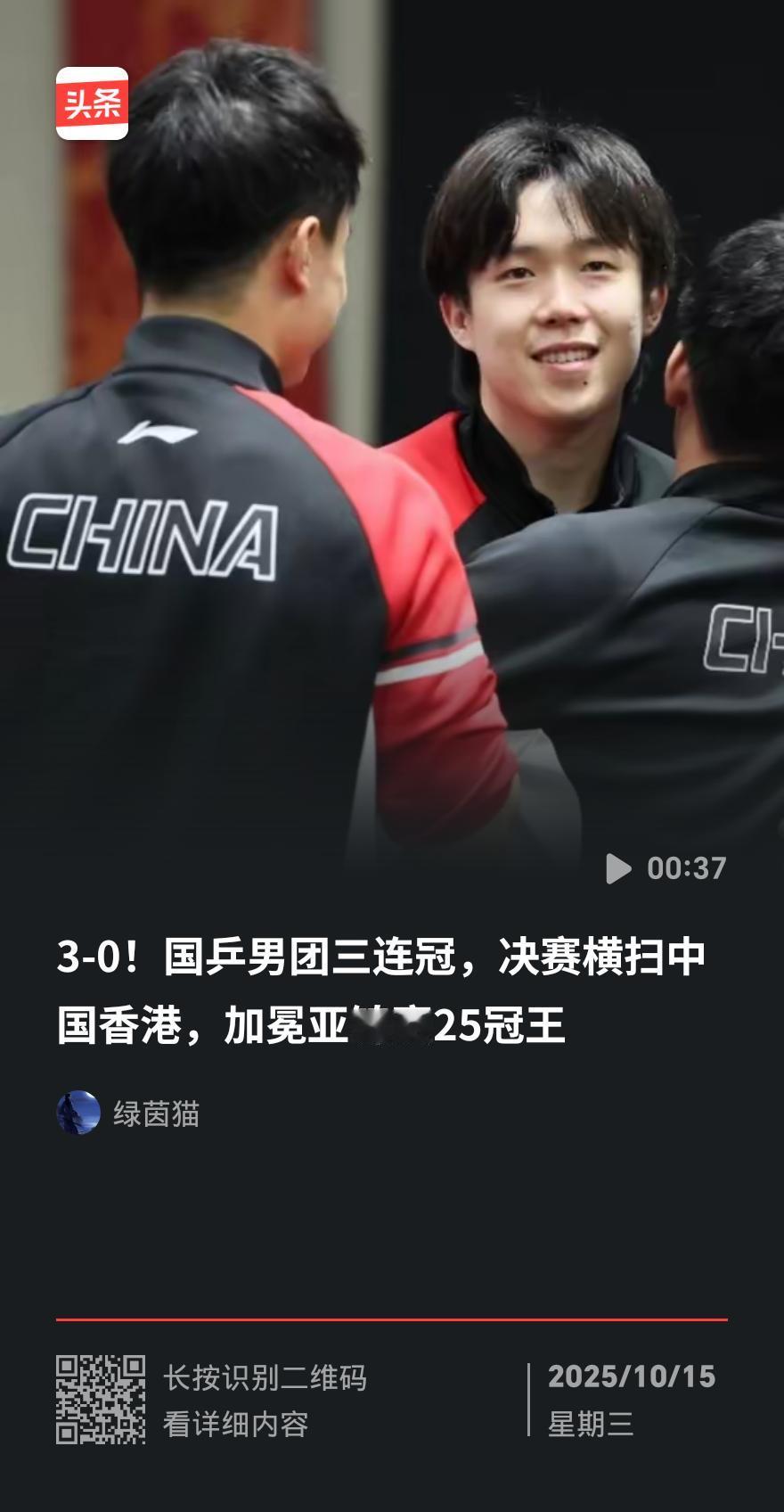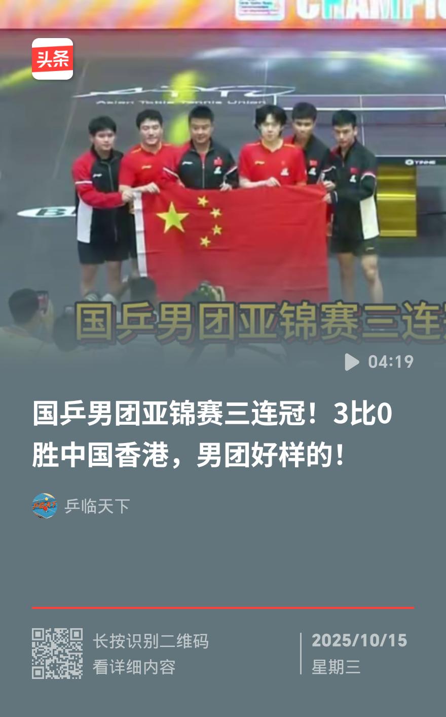 快讯!国乒男团3-0横扫中国香港,豪取三连冠 10月15日晚,印度布巴内斯瓦尔亚锦赛赛场。中国男乒像出鞘利剑,3-0完胜中国香港队,稳稳将男团三连冠奖杯收入囊中。 林诗栋先声夺人,3-0碾压黄镇廷,延续交手零丢局纪录。王楚钦遭遇苦战,14-12险胜陈颢桦,上演“心跳时刻”。梁靖崑顶住压力,3-0拿下姚钧涛,锁定胜局。 要知道,国乒此前连闯伊朗、日本两关,都是从绝境里“死磕”出来的。这场决赛总算打了场痛快仗,球迷直呼“看得比喝冰汽水还爽”!亚锦赛男乒 男团亚锦赛 亚锦赛男团赛