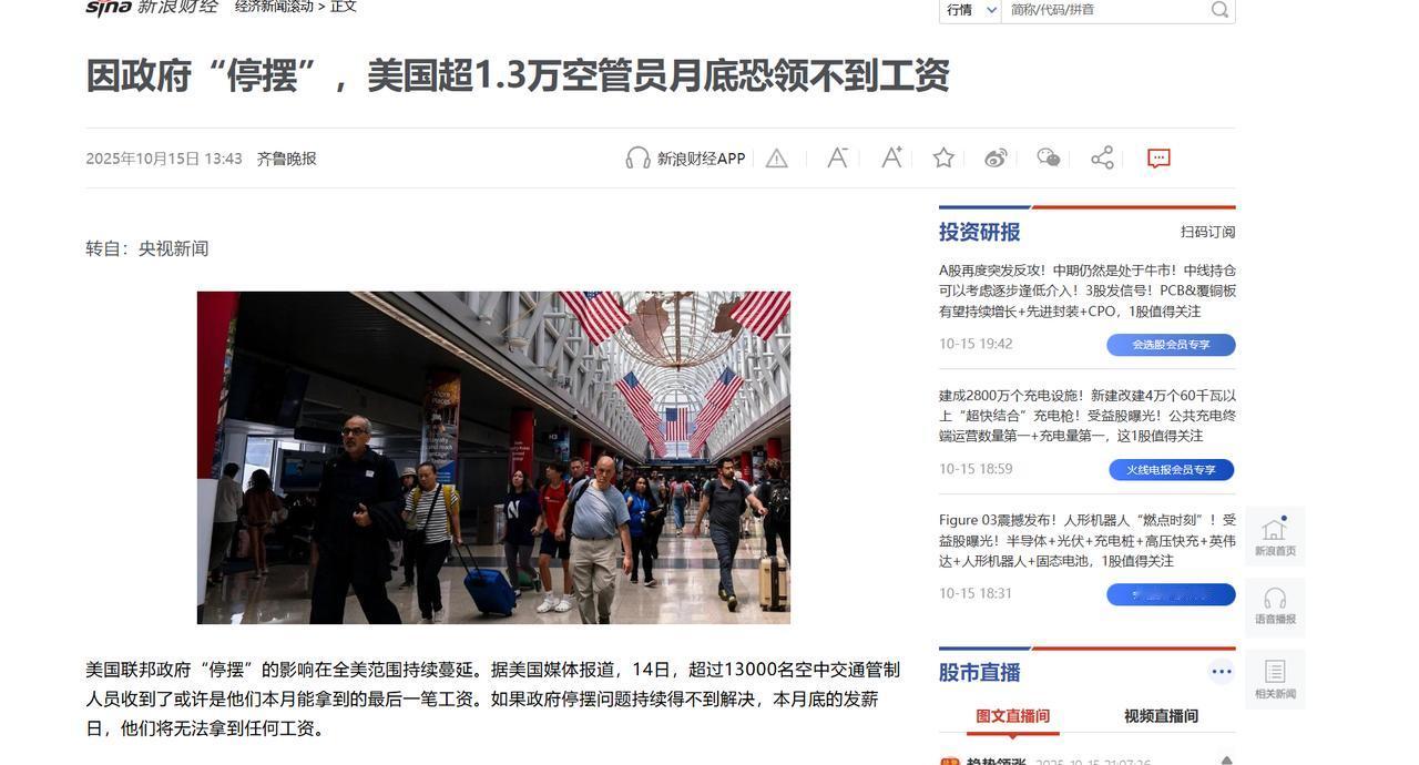 美国联邦政府宣布了 10月15日,美国联邦政府停摆14天了,1.3万多名空中交通管制员14号收到本月最后一笔工资,月底要是还没解决就拿不到钱了。 政府从 10 月 1 号就停摆了,根子就是两党在医保开支上谈不拢,新的预算方案一直没通过,政府账户里没钱了,自然没法给员工发工资。 别觉得 “医保开支分歧” 是啥复杂事,说白了就是共和党嫌现在医保花得太多,非要把预算砍 15%,说要平衡国家财政. 可民主党不答应,因为这笔钱关系到 2300 万低收入美国人的看病问题,一砍下去,好多家庭就真的看不起病了。 两边都抱着自己的小算盘:共和党想靠 “砍开支” 的名头拉选票,民主党想靠 “保福利” 稳住自己的支持者,结果把国家正常运转和普通人的饭碗当成了党争的筹码,完全不管底下人的死活。 这些空管员有多重要?全美每天差不多 4 万架次航班,不管是小的私人飞机,还是载着几百人的国际客机,全靠他们在塔台里盯着雷达调度,差一秒、差一千米的距离,都可能酿成大事故。可现在呢?他们成了两党争斗的牺牲品。 更让人揪心的是,美国的空管系统早就缺人了,缺口大概有 3500 人,好多空管员平时就只能一周休一天,连喘口气的时间都没有。 现在政府一停摆,不光空管员没工资,连负责维护管制设备、搞后勤保障的员工也都离岗了,剩下的空管员担子更重了,累得快扛不住了。 就这几天,全美已经有好多航班出问题,延误或者取消的航班数量特别多,差不多每 5 架飞机里就有 1 架没法正常飞。 有时候甚至会出现空域管制中心没人手的情况,只能靠临时调度撑着,想想都后怕。万一这时候有突发情况,比如飞机出故障要紧急降落,没人及时调度怎么办?那后果根本不敢想。 别以为空管员工资高就不在乎这点钱,他们的日子其实也紧巴巴的。刚入职的年轻空管员,一年也就挣 6 万多美元,就算是干了几年的老手,平均下来一个月也就六七千美元。 这笔钱扣完税,再去掉房贷、车贷,剩下的也就够日常开销,根本没多少结余。现在停摆才一周多,就已经有不少空管员快撑不住了,得靠去食品银行领救济粮才能过日子。 食品银行就是给没钱吃饭的人免费发吃的地方,想想看,这些保障国家航空安全的人,居然要靠领救济才能活下去,这算什么事啊? 之前 2018 年底美国也有过一次政府停摆,那次更惨,整整持续了 35 天。当时好多空管员实在撑不下去,只能请假去打零工,有的去超市理货,有的去送外卖,就为了挣点钱交房租、养孩子。 那时候因为空管员分心,航空安全也出过好几次险,差点就出大事。现在这情形比上次还糟,美国经济本来就不好,GDP 增速才 1 点多,政府每停摆一周,国家就得少赚 150 亿美元。 要是真像有些政客说的那样,这次停摆变成 “史上最长”,不光是空管员要遭殃,整个国家的航空安全都得打折扣,经济也得跟着受大影响。 最可气的就是两党的态度,明明知道停摆的危害,却没人愿意退一步。他们各自提的方案都被对方否决,却只会互相骂街:共和党骂民主党不顾国家财政压力,民主党怪共和党不管老百姓的死活,就这么耗着,把时间全浪费在争吵上。 空管员工会的主席说得特别实在:“他们把党争看得比国家利益还重,把我们这些普通人当成了牺牲品,这太不公平了。” 是啊,那些政客住着豪宅、拿着高薪,从来不用愁没饭吃、交不起房租,他们哪知道普通人没工资的日子有多难?他们争论的那些医保预算数字,对老百姓来说,就是能不能看上病、能不能给孩子买奶粉的活命钱啊! 现在离月底就剩半个月了,1.3 万空管员还在硬扛着。他们每天早上起来第一件事就是看新闻,盼着两党能赶紧达成一致,可每次看到的都是 “谈判破裂”“互相指责” 的消息,心里的希望一点点变冷。 可就算再绝望,他们也得强打精神去塔台,因为他们知道,自己一离岗,好多飞机就没法飞,好多人的安全就没保障。 有不少空管员在网上发过自己的日常:桌上摆着最便宜的泡面,窗外就是准备起飞的飞机,配的文字特别戳心:“我管着上百人的安全,却管不了自己的晚饭。” 说真的,“政府停摆” 听着像是个离普通人很远的政治话题,可落到实处,就是一个个普通家庭的困境。这些空管员守着最关键的岗位,保障着最基本的安全,却连一份安稳的工资都拿不到,连好好过日子都成了奢望。 两党要是还有点良心,就该赶紧放下那些没用的争执,先把预算批了,让这些养家糊口的人能踏实干活,让坐飞机的人能安心出行。 再这么闹下去,伤的是普通老百姓的心,毁的是整个国家的秩序,这笔账,那些政客真该好好算算!