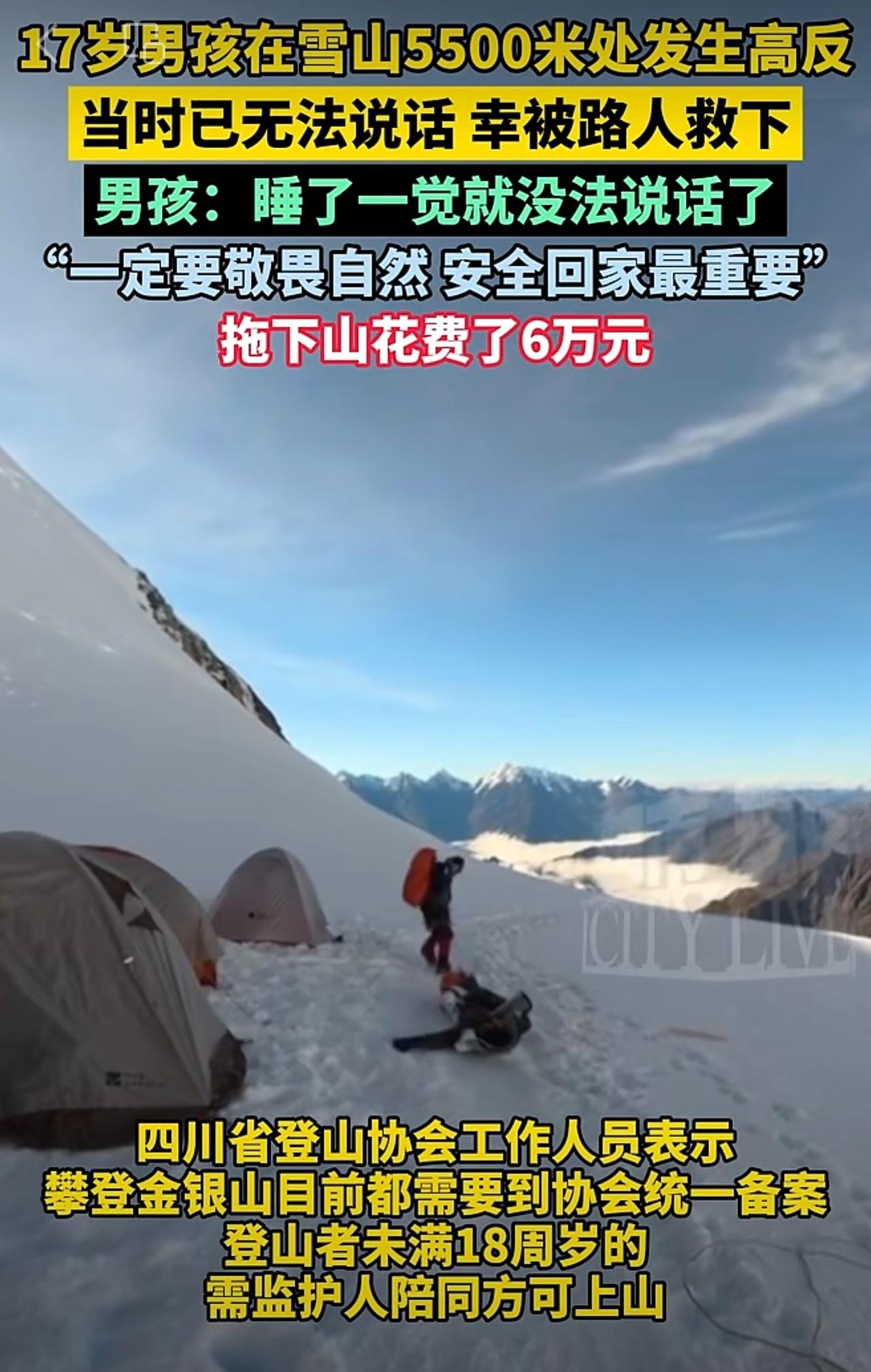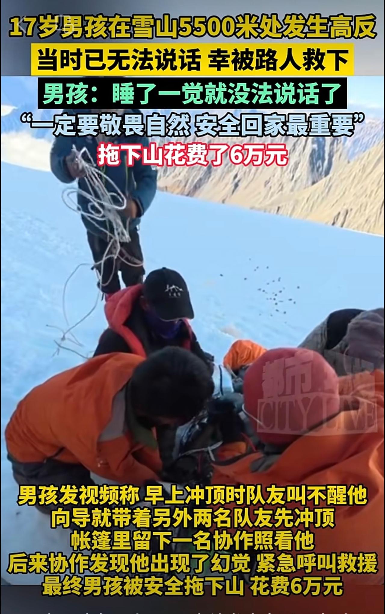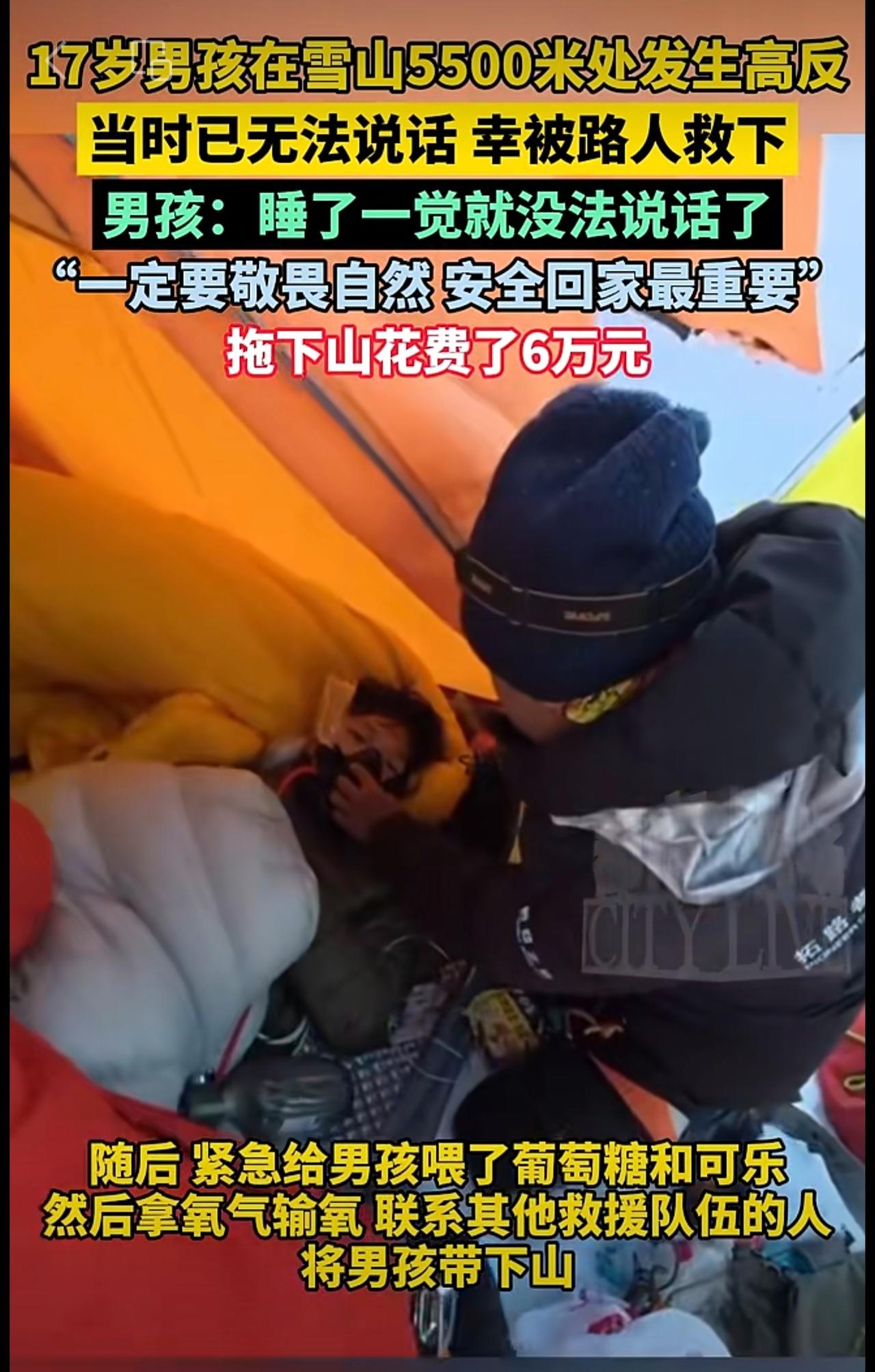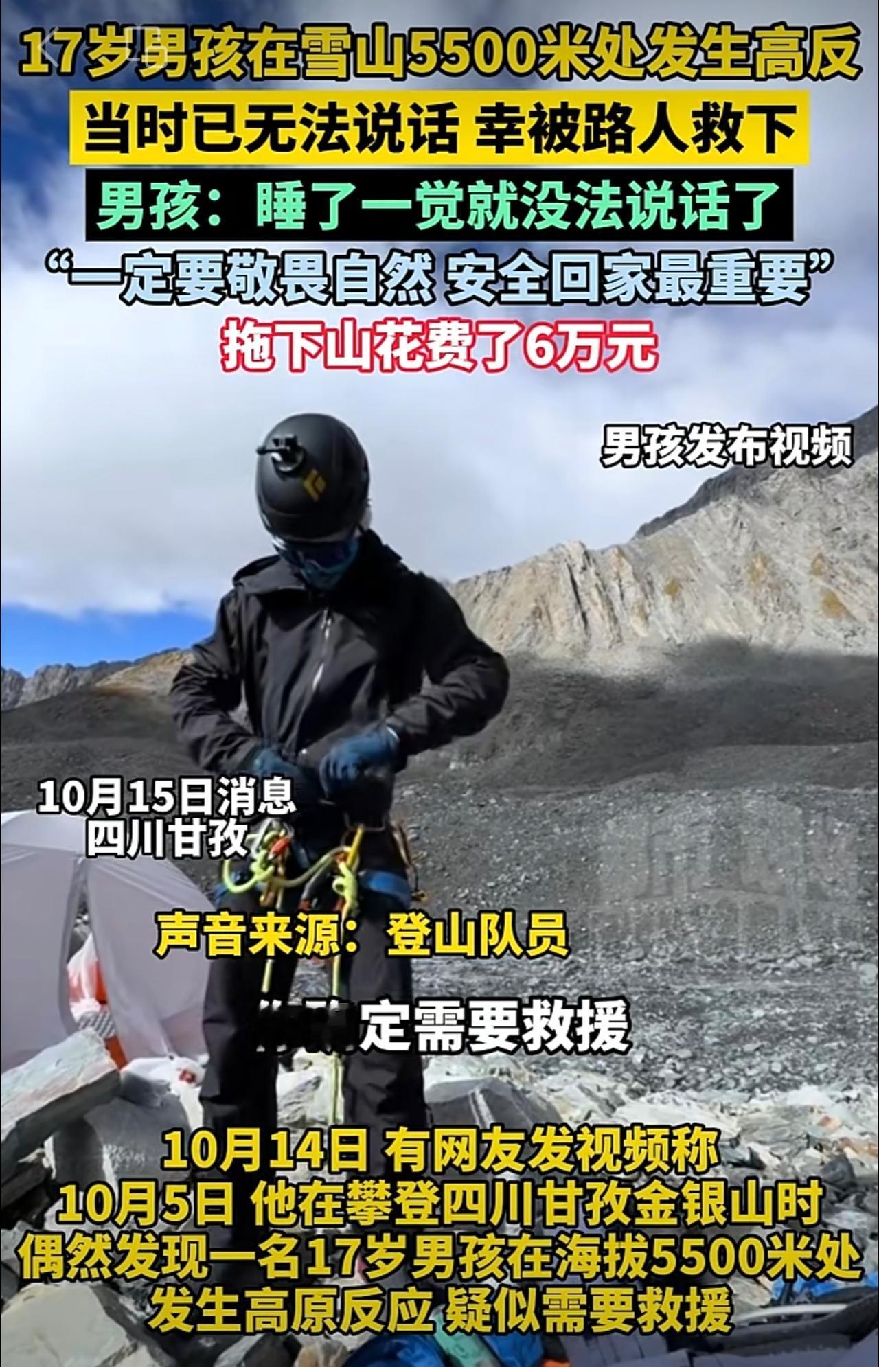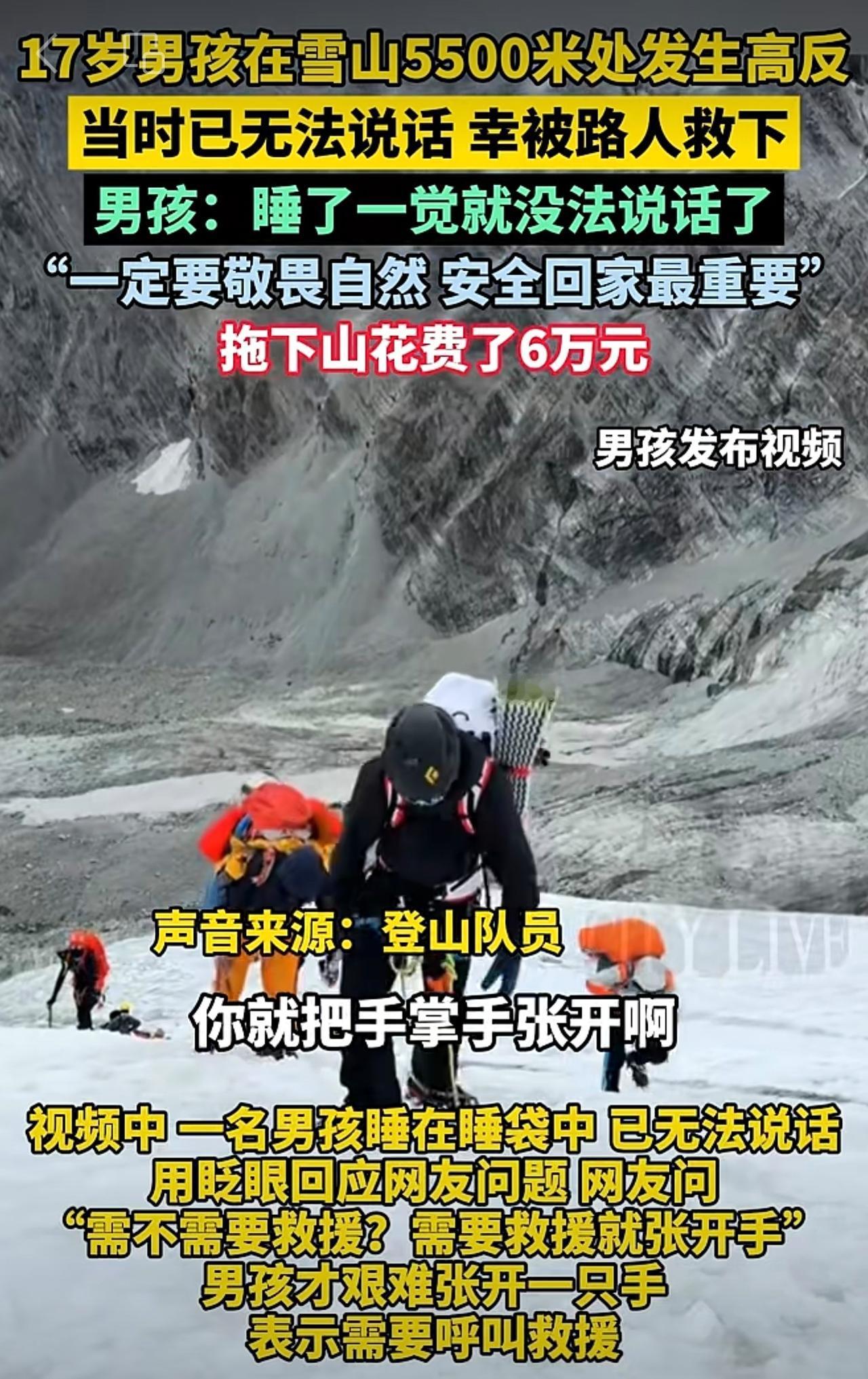 17岁男孩在雪山5500米处发生高反,当时已无法说话,幸被路人救下,男孩:睡了一觉就没法说话了,拖下山花费了6万元男孩在雪山5500米处高反被救下 金银山