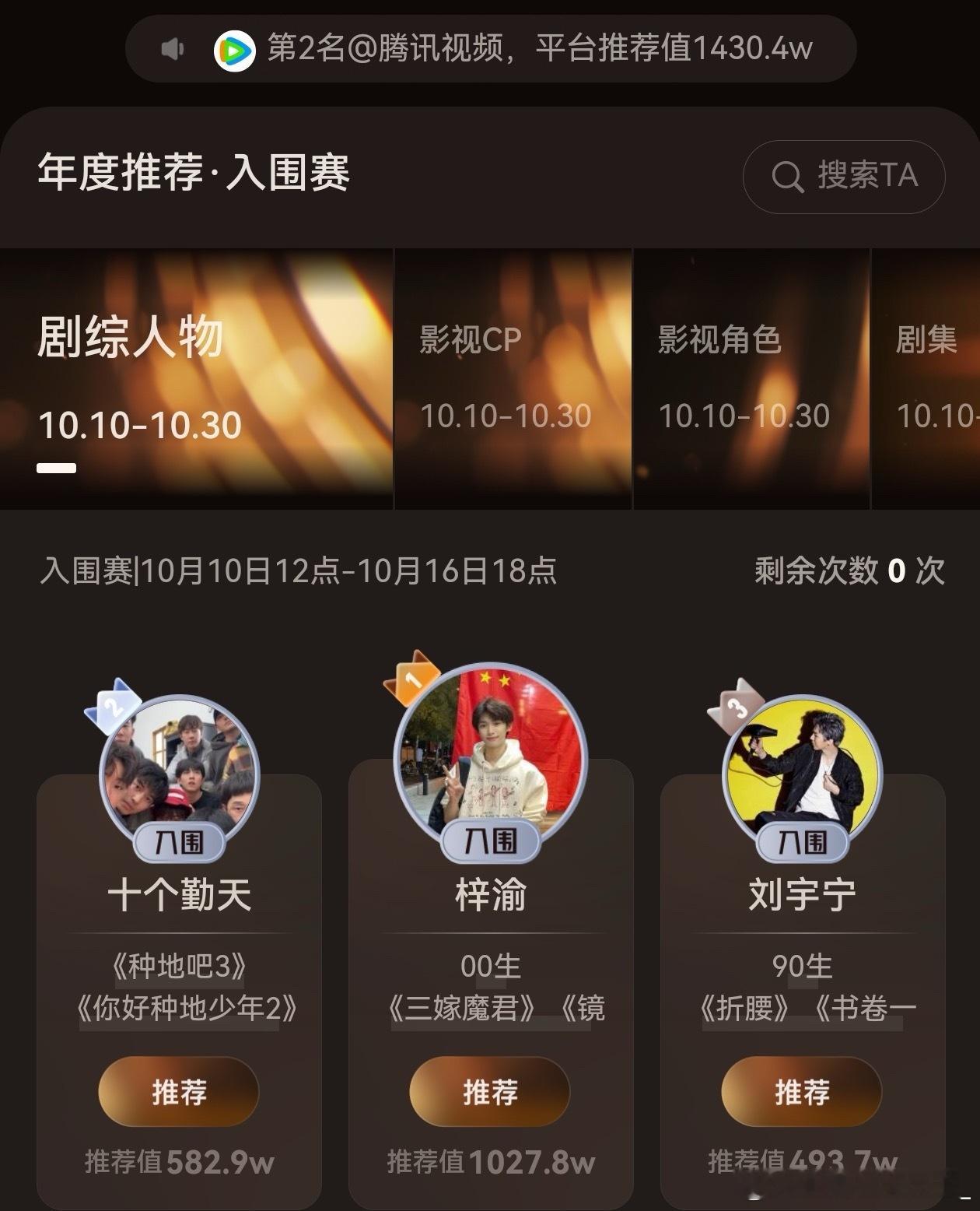 梓渝剧综人物首位破千万推荐值梓渝剧综人物推荐值破1000万