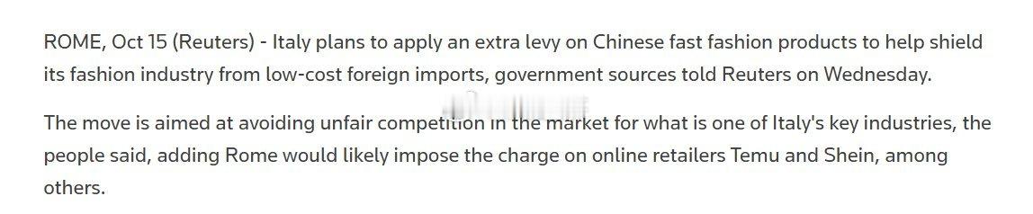 路透:意大利政府消息人士透露,意大利计划对中国快时尚产品公司Temu和Shein等征收额外税费。