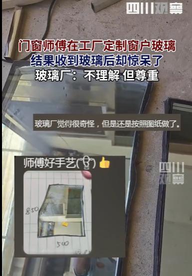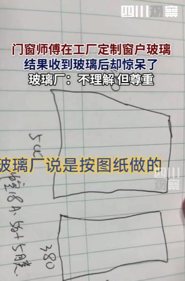 “离了个大谱!”2025年10月,江西,一男子亲自“手绘”图纸找工厂定制窗户玻璃,没想到收到成品后他傻了眼,只见玻璃四个边歪歪扭扭,工厂方面称是按图加工,男子瞬间明白了什么,网友:工厂接你这一单不为挣钱,只为炫技! 在定制玻璃时,都是需要提前测量好长宽、形状告知工厂,很多玻璃工厂都能做异形玻璃,就有“马大哈”在定制时没说清楚需求,结果闹出了笑话。 一男子是名门窗师傅,这天,男子找到工厂定制两块窗户钢化玻璃,他觉得画图比说更加直观,便亲手绘制了一张图纸,并在上面细心标注出了长宽。 男子觉得这样一来就能万无一失,谁知,收到货时他却傻了眼,只见眼前的玻璃边缘歪歪扭扭,看起来十分滑稽,就像一个“哈哈镜”一样。 这样的玻璃男子根本没法用,他十分生气,赶紧联系工厂询问原因,工厂方面无辜地表示这就是按照男子的图纸做的,绝对没有差别。 男子很疑惑,掏出之前自己画的图纸查看,这才发现,自己随手画的两个线条歪歪扭扭长方形,竟然让商家误以为就是要定制这种形状的,仔细看看甚至连一些小拐角都一模一样,商家这还真是按图定制! 不少网友认为商家这分明是在炫技,有人将玻璃的图片截取下来缩小,竟然能和男子画的图完全完全融合,以后定制玻璃时一定要提前和工厂商量清楚啊! 信息来源:《门窗师傅在工厂定制玻璃,收到后惊呆了!玻璃厂:不理解,但尊重》四川观察