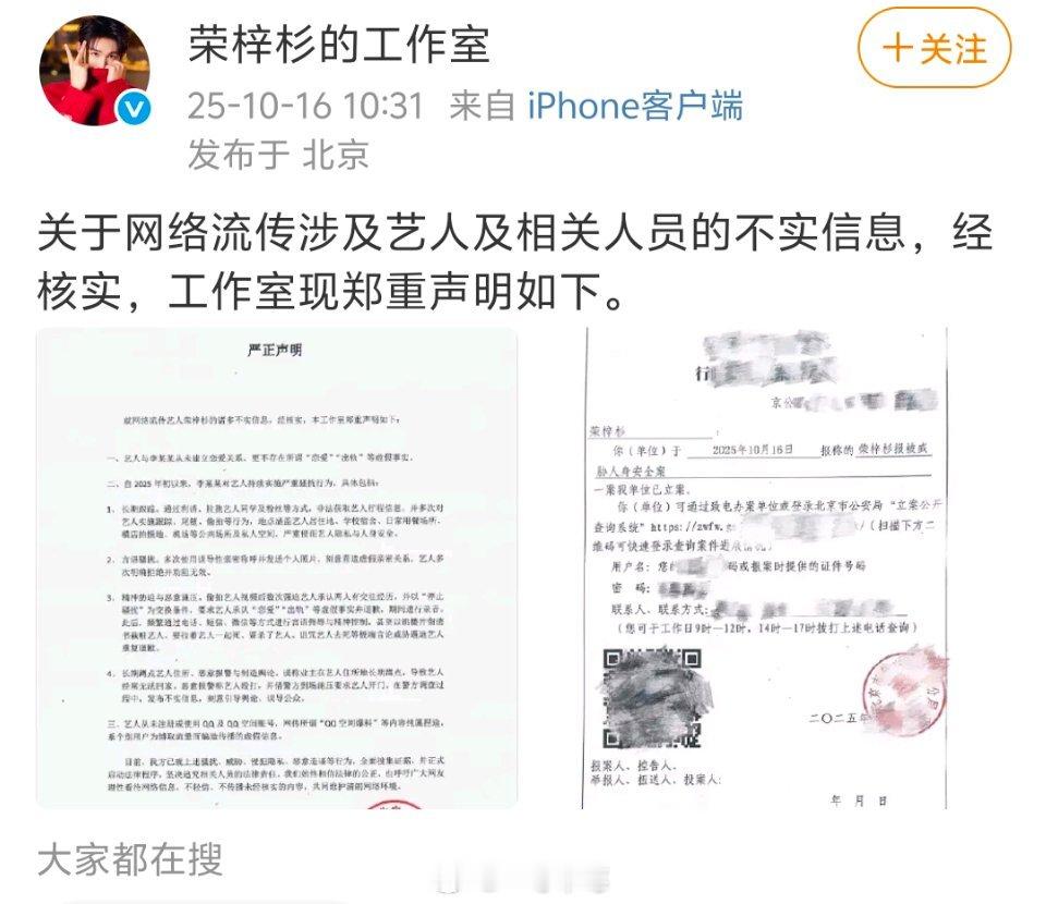 荣梓杉工作室回应并否认恋爱、出轨等传闻