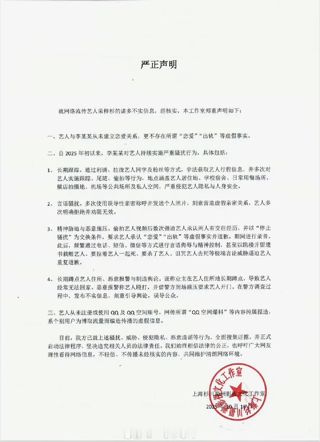 荣梓杉工作室回应并否认恋爱、出轨等传闻
