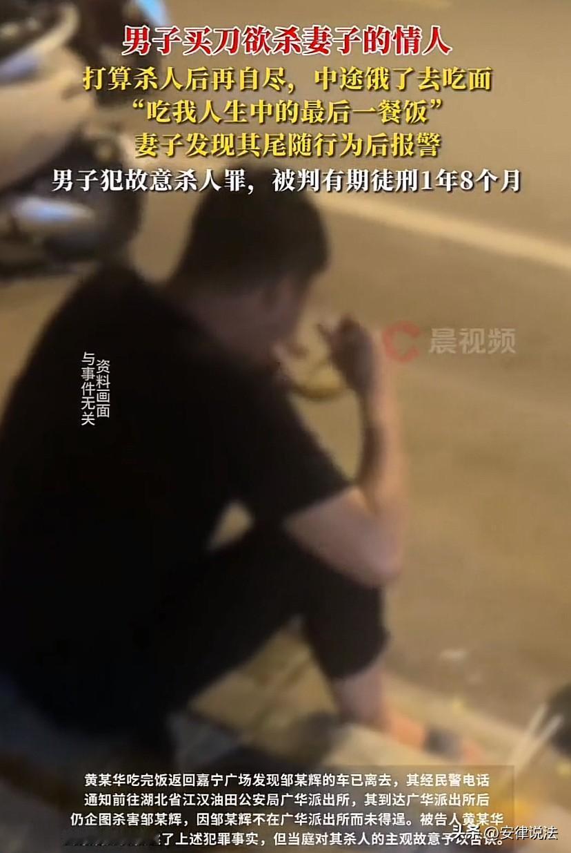 “冤不冤?”湖北潜江,男子发现妻子出轨后,花15元买了一把水果刀,企图杀害妻子的情人后再自尽,中途饿了,打算去吃“人生中最后一碗肥肠面”,结果被妻子发现报警,而后被法院以故意杀人罪,判处有期徒刑1年8个月! 据悉,男子黄某与女子鲜某系夫妻关系。 2019年,鲜某与男子邹某结识,并于2021年左右,与邹某发展为不正当关系。 2024年6月,黄某发现鲜某与邹某的不正当关系,冲动之下把邹某的车砸了!而后经调解黄某赔偿了邹某4.3万元,邹某承诺不再追究黄某的责任并与鲜某断绝关系。 2024年11月一天,黄某在驾校接鲜某回家时,恰巧看到邹某,认为邹某不守信用,还与自己妻子保持着不当联系,与鲜某争吵后,便骑车去追邹某。 黄某尾随邹某至一商业广场,而后看到邹某从车内出来并上了楼。 随后,黄某前往附近的超市花15元买了一把不锈钢水果刀,企图杀害邹某而后自杀。 等待邹某期间,黄某因感到饥饿,打算去吃“人生中最后一碗肥肠面”,便离开现场去一美食街要了一碗肥肠面。 而在这一过程中,邹某联系鲜某,称被黄某尾随、堵截,鲜某于是报了警。 民警接到报警,将鲜某、邹某带到派出所进行进一步的调查。 而吃完饭的黄某再次返回现场,发现邹某已经离开。 随后,黄某接到民警的电话,得知邹某被民警带到派出所,于是便也前往派出所。 黄某原本打算见到邹某后,等和邹某一起出派出所后,再趁机杀害邹某而后自杀。但是到了派出所后,发现邹某已经离开。 随后,黄某情绪激动,说明了事情的经过,以及想要杀害邹某而后自杀的计划,并把藏在衣服里的水果刀拿了出来、丢在派出所的桌子上给鲜某、民警看,以证明自己不是开玩笑。 结果悲剧了,被警方以涉嫌故意杀人罪立案调查,而后移送检方审查起诉。 法庭上,面对检方的控诉,黄某慌了,又翻供称,没有杀害邹某的意图,买刀只是为了吓唬邹某,让邹某离自己老婆鲜某远一点。 那如何看待此事?黄某的行为构不构成故意杀人罪?法院最终是怎么给黄某定罪量刑的呢? 根据刑法理论,犯罪需同时满足主观故意或过失、客观危害行为等要件,仅有犯罪意图未付诸行动不构成犯罪。 而如果一旦将犯意付诸行动,根据达到的阶段的不同,又分为犯罪预备、犯罪未遂、犯罪中止和犯罪既遂。 犯罪既遂比较好理解,就是成功实施犯罪行为并达到了犯罪的目的。 而犯罪预备是指犯罪分子在准备犯罪工具、物品、制造条件的过程中还未进入实施阶段被发现。 犯罪中止是指在犯罪过程中,自动放弃犯罪或者自动有效地防止犯罪结果发生的。 犯罪未遂则是,则是指犯罪分子已经着手实行犯罪,由于犯罪分子意志以外的原因而未得逞。 具体到本案,黄某主观上具有杀害邹某的故意,客观上尾随、购买刀具,还没有实施犯罪行为,便被警方发现,符合故意杀人预备犯的构成要件。 应当注意的是,翻供不是想翻就能翻! 最高院关于适用《刑事诉讼法》的解释,第96条规定,审查被告人供述和辩解,应当结合控辩双方提供的所有证据以及被告人的全部供述和辩解进行。 被告人庭审中翻供,但不能合理说明翻供原因或者其辩解与全案证据矛盾,而其庭前供述与其他证据相互印证的,可以采信其庭前供述。 被告人庭前供述和辩解存在反复,但庭审中供认,且与其他证据相互印证的,可以采信其庭审供述;被告人庭前供述和辩解存在反复,庭审中不供认,且无其他证据与庭前供述印证的,不得采信其庭前供述。 具体到本案,由于黄某在侦查阶段供述尾随、买刀欲杀害邹某而后自杀的事实,派出所的监控视频,也能证明黄某的犯意。黄某庭审中翻供又没有正当的理由支撑。法院认为黄某翻供不成立。 《刑法》第22条规定:为了实施犯罪,准备工具、制造条件,是犯罪预备。对于预备犯,可以比照既遂犯从轻、减轻处罚或者免除处罚。 第232条规定,故意杀人的,处死刑、无期徒刑或者10年以上有期徒刑;情节较轻的,处3年以上10年以下有期徒刑。 综上,法院最终以犯故意杀人罪,判处黄某有期徒刑1年8个月。 最后,黄某本是感情中的受害者,结果因为一时冲动,反而将自己送进牢狱!着实是令人唏嘘! 其案件也再次提醒广大朋友们,在处理感情纠纷时,一定要保持冷静!理性! 这事您怎么看?欢迎在评论区留言,与大家一起交流您的看法! ------ 关注@安律说法 案例中看人生百态,法律中寻破局之法!