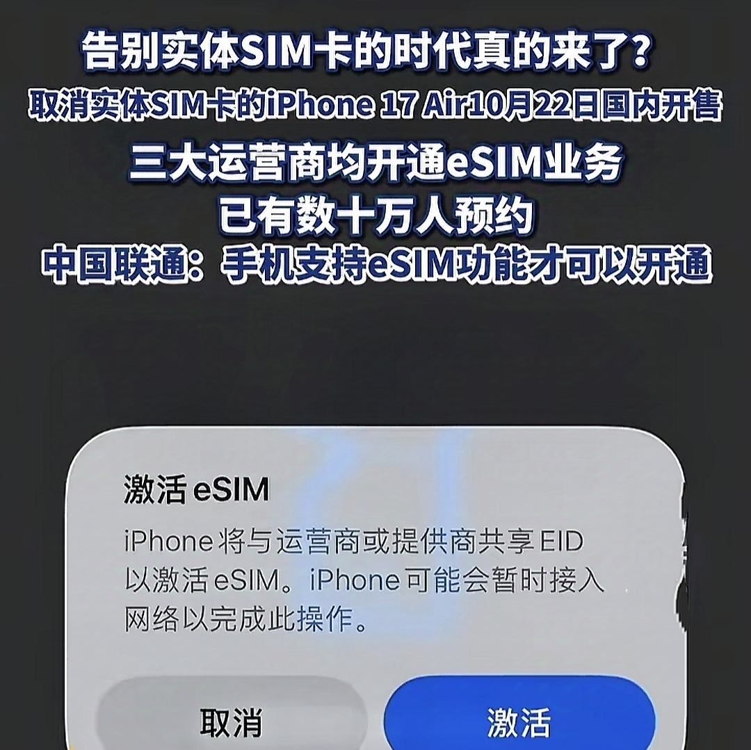 现在已经完全确定iPhone Air满月复活,将在10月22日开售,看来等等党又赢了!根据了解,三大运营商宣布消息后,预约开通eSIM业务的人数已经突破数十万,联通表示只有支持eSIM功能的手机才能开通。现在最尴尬的还是国产手机,因为国产机全部不支持eSIM,恐怕这一次iPhone Air要卖疯了,另外美版iPhone、港版iPhone应该也会迎来一波销量上涨。