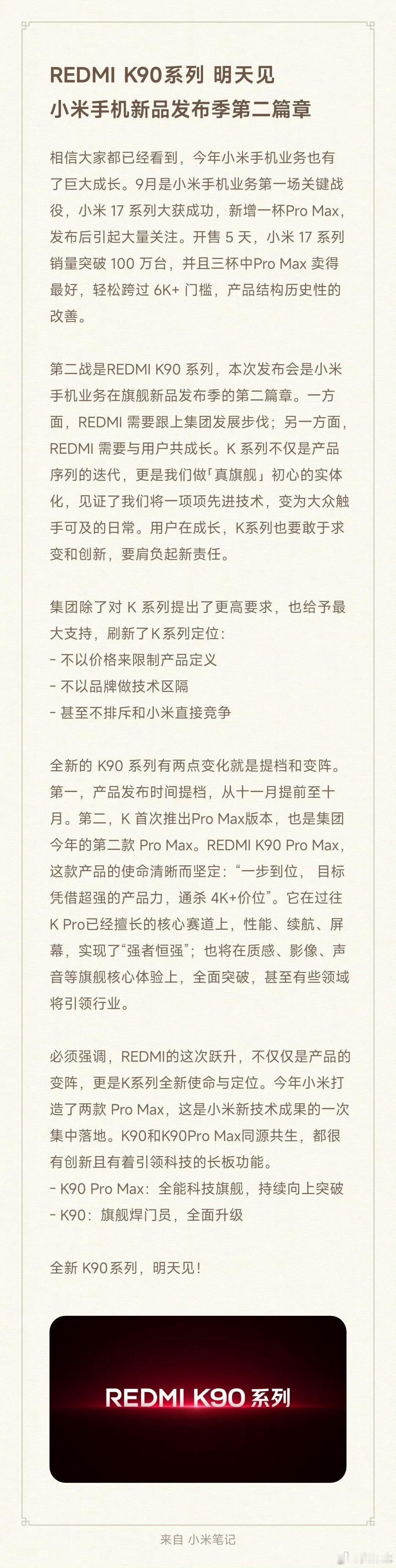 我隐隐约约觉得这次K90系列要重现K20真旗舰荣光了。标准版旗舰焊门员大号米17,K90 Pro Max全能科技旗舰上探4K+价位,给友商旗舰一点REDMI震撼。现在没有什么小米和红米了,K90放下包袱就是要做真旗舰,看看卢总说的什么话?不以价格来限制产品定义,不排斥和小米直接竞争,我感觉K90稳了[笑cry]
