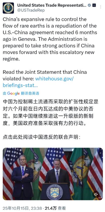 美国贸易代表格里尔昨晚(北京时间10月15日晚)在新闻发布会上批评中国违反协议:“中国为控制稀土流通而采取的扩张性规定是对六个月前在日内瓦达成的中美协议的否定。 如果中国继续推进这一升级版新机制,美国政府准备采取强硬措施。 ”评几句:所谓 “日内瓦协议否定论” 根本站不住脚。 2025 年 5 月日内瓦会谈达成的协议明确以 “互谅互让” 为核心,中方随即调整对美关税回应诚意,而美方却在协议墨迹未干时就启动 “层层加码”:10 月 11 日特朗普突然宣布 11 月起对全部中国商品加征 100% 额外关税,此前更扩大半导体出口管制、对中国船只加收港口费,将协议中的 “关税缓和” 条款彻底架空。 格里尔口中的 “扩张性规定”,实为中国 10 月 9 日推出的稀土出口许可制度 —— 但这绝非无端之举。 商务部早已提前通报美方,只是美方彼时正沉迷于 “关税施压” 未予重视。 更关键的是,协议仅要求中方 “调整非关税措施”,从未禁止中国基于国家安全实施出口管制,而稀土作为军工核心原料(F-35 战机每架需 400 公斤稀土),其流向管控本就是主权国家的正当权利。 事实上,美国的违约早有前科。 6 月中美签署稀土 “谅解协议” 后,美方刚拿到 353 吨稀土磁体出口(同比暴涨 660%),转头就抛出 “新条件”—— 要求将中国与俄伊能源采购纳入协议约束,试图用 “稀土换能源主权” 的捆绑交易掏空协议根基。 这种 “拿到好处就加码” 的操作,与此次先破坏关税承诺、再倒打一耙的逻辑如出一辙。 更具讽刺的是,美方所谓 “协议精神” 本身就是双重标准。 日内瓦协议要求 “解除不合理限制”,但美国至今未撤销对中国商飞 C919 零部件的禁运,也未放开 STEM 留学生签证限制,反而变本加厉强化技术封锁。 正如商务部长卢特尼克坦言,“稀土问题是我们最大的痛点”—— 美方的愤怒,本质是对自身供应链依赖中国的焦虑,而非对 “规则” 的珍视。 至于格里尔威胁的 “强硬措施”,更像是色厉内荏的表演。 美国 83.7% 的稀土依赖中国供应,重稀土依存度高达 97%,即便内华达州开采稀土矿,仍需将矿砂运回中国提纯。 中国不仅掌控 90% 的永磁体产能和 80% 的分离专利,更通过 “纳米追踪芯片”“军工熔断机制” 精准管控流向,美方所谓 “供应链替代” 至少需要十年时间。 反观中国的稀土管制,始终在法律框架内运行:仅限民用、逐单审批、提前通报,完全符合国际通行的国家安全原则。 真正 “否定协议” 的,是美方将贸易问题政治化、动辄挥舞关税大棒的霸权行径。 当白宫试图用 100% 关税威胁中国时,或许该先看看自家股市 ——10 月 10 日道指暴跌 2000 点的教训,早已说明谁才是规则破坏的最终受害者。