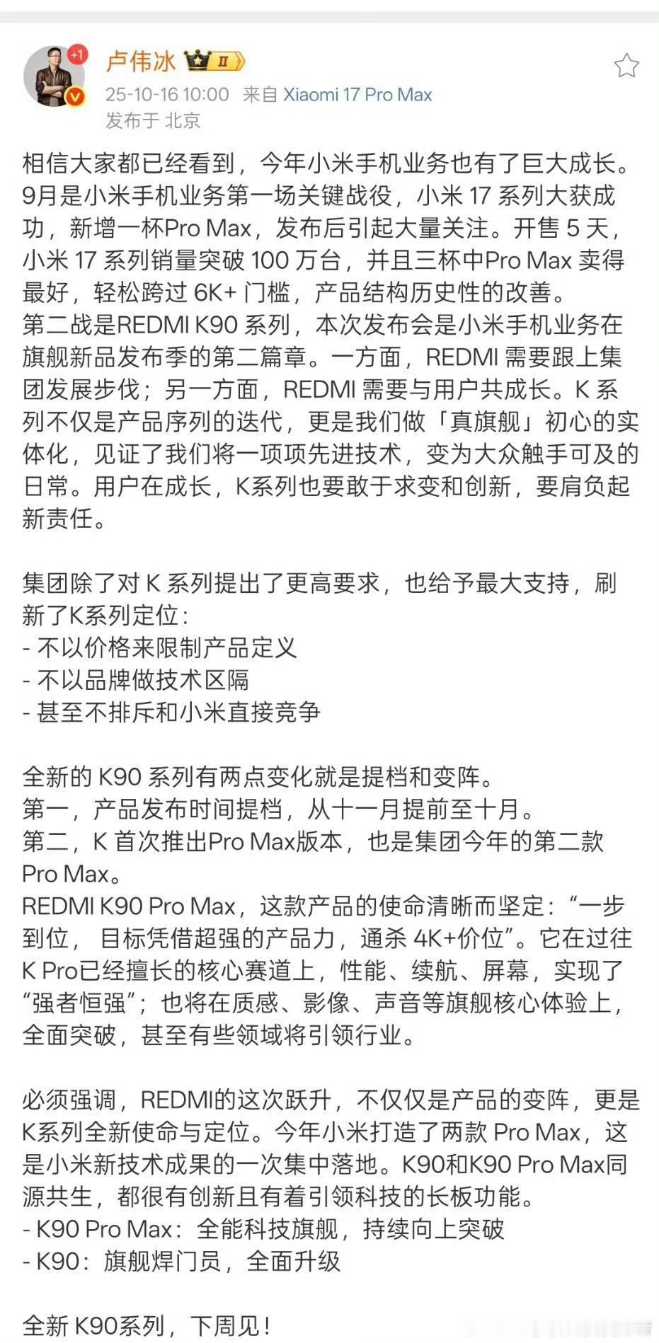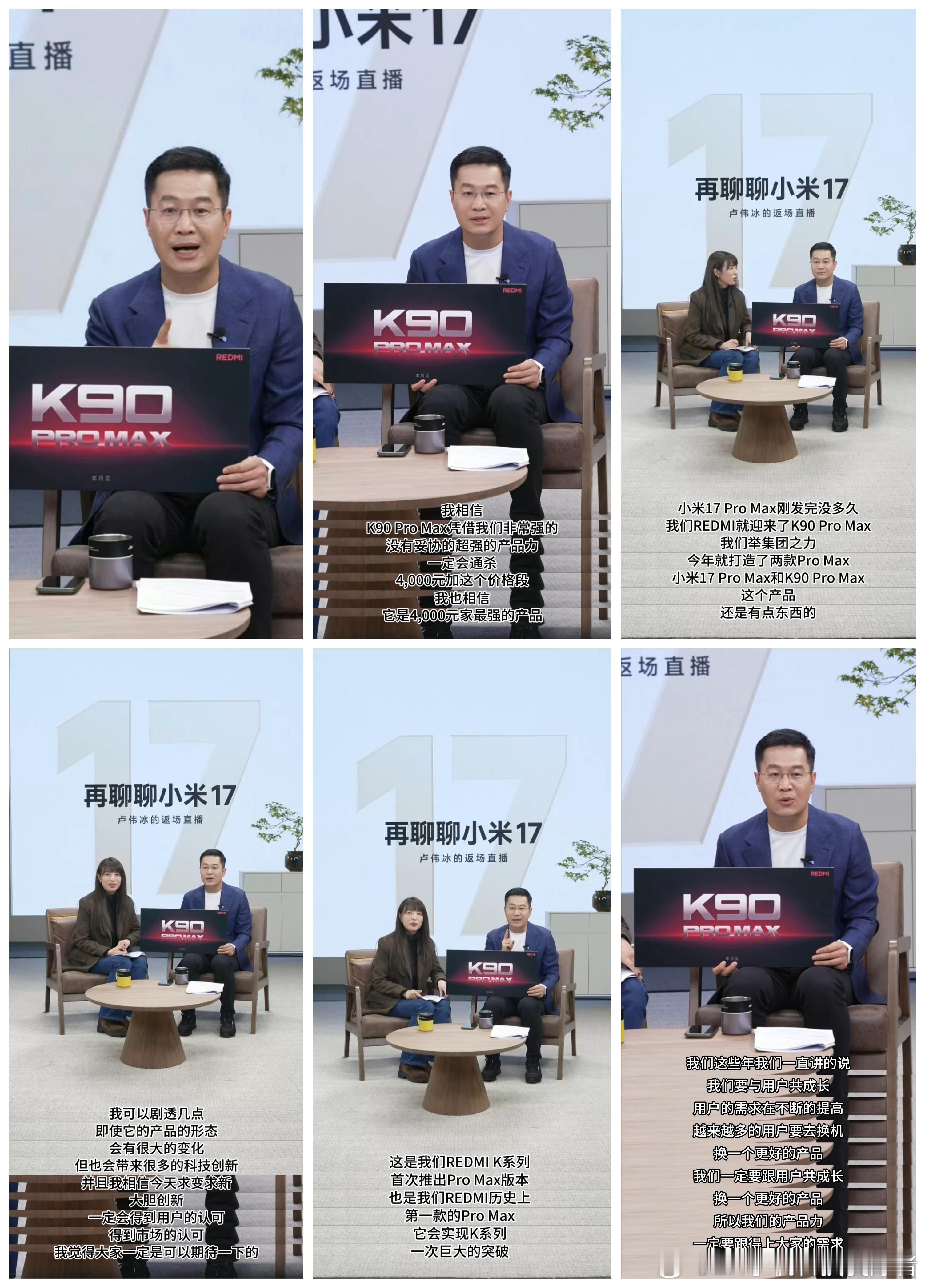 今年各大子品牌产品竞争力都很强,既然红米敢这么宣传,估计是真有东西,据说参数方面是史诗级升级。红米K90 Pro Max估计可以看做是没有背屏版的小米17 Pro Ma,,这个配置卖4000元以上倒也没问题。卢伟冰称K90不排斥和小米直接竞争