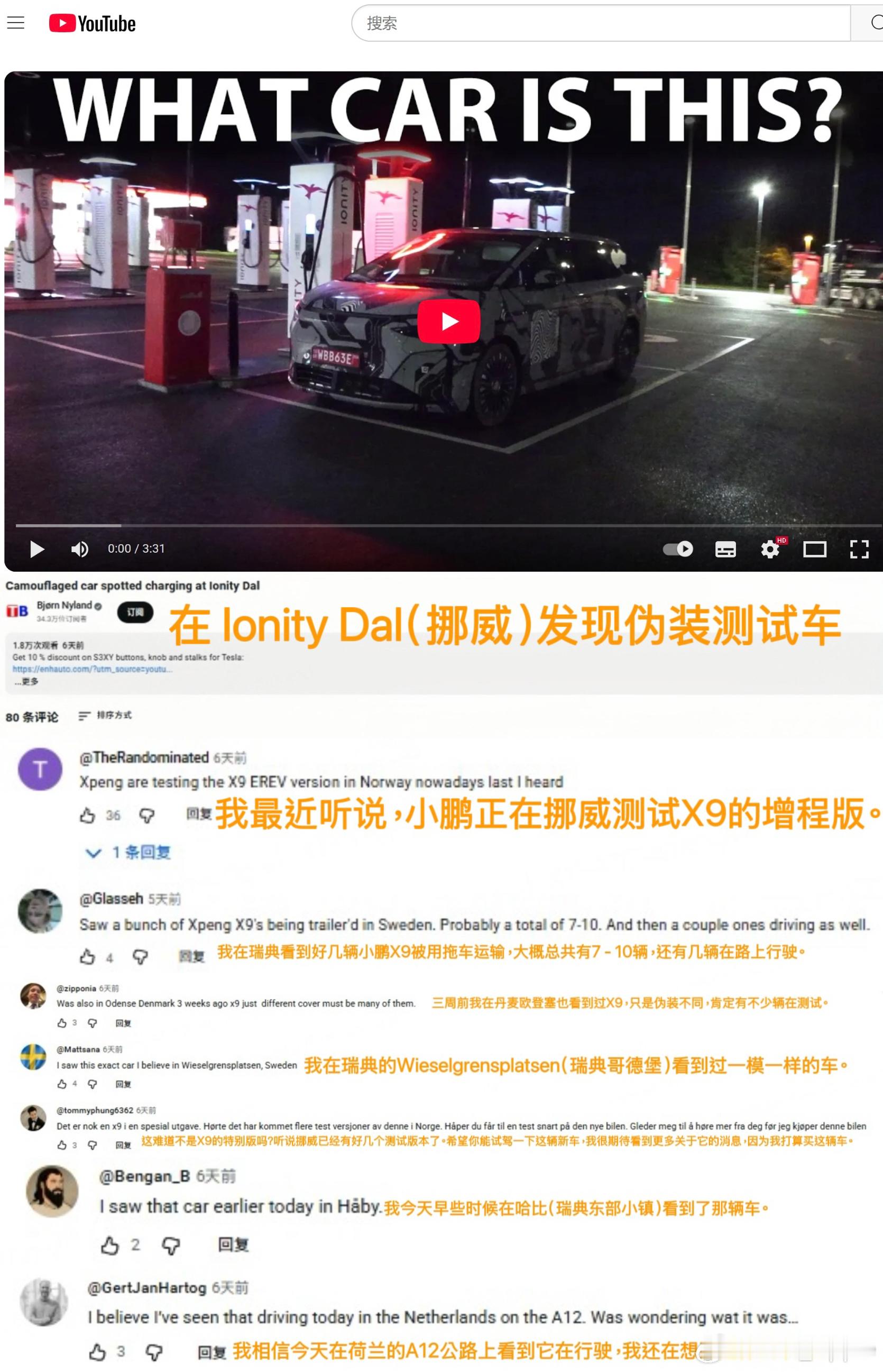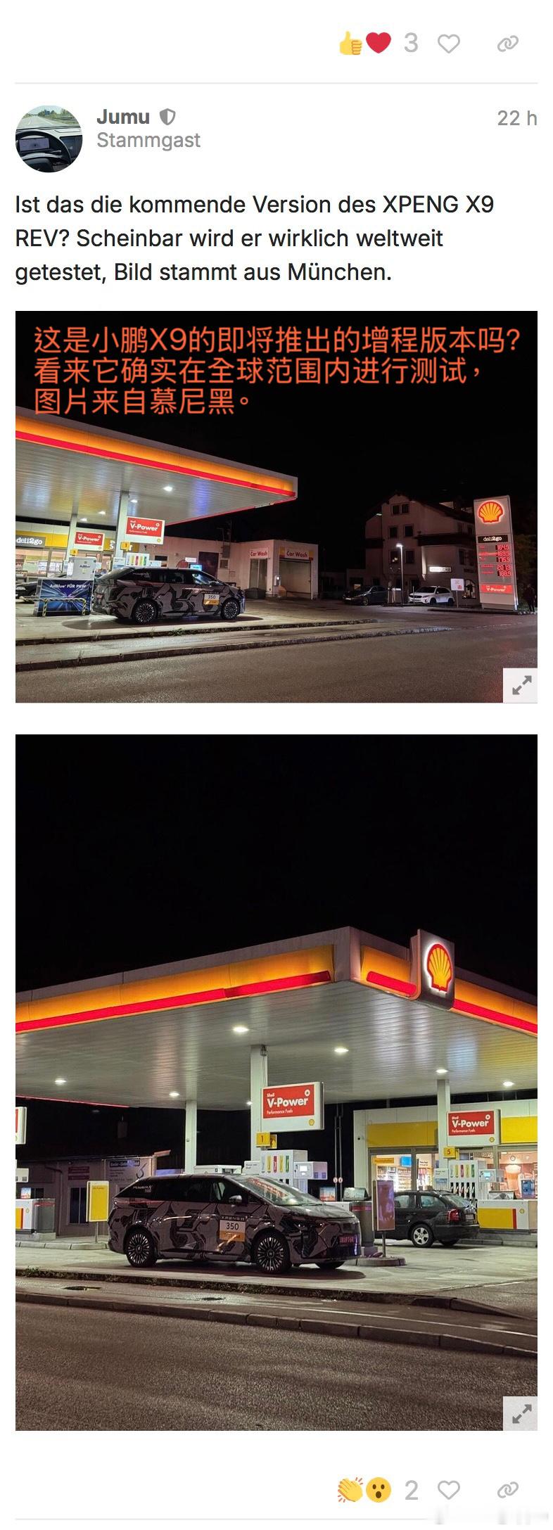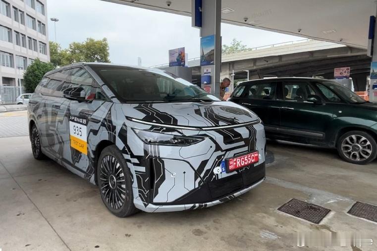 新款小鹏X9现在正在欧洲做全球标定测试,在欧洲好几个国家的加油站加油的时被外国网友拍到了[哇]