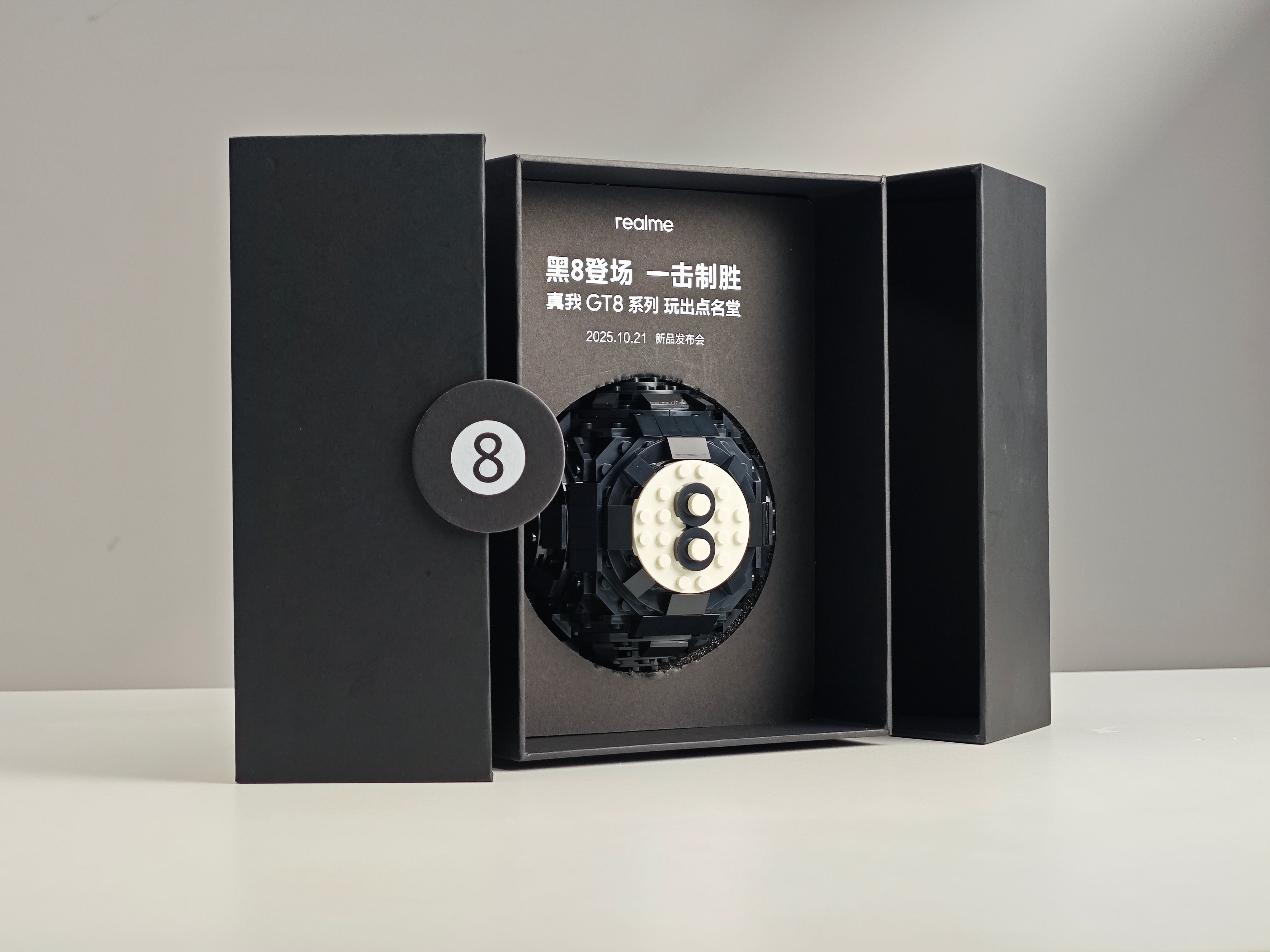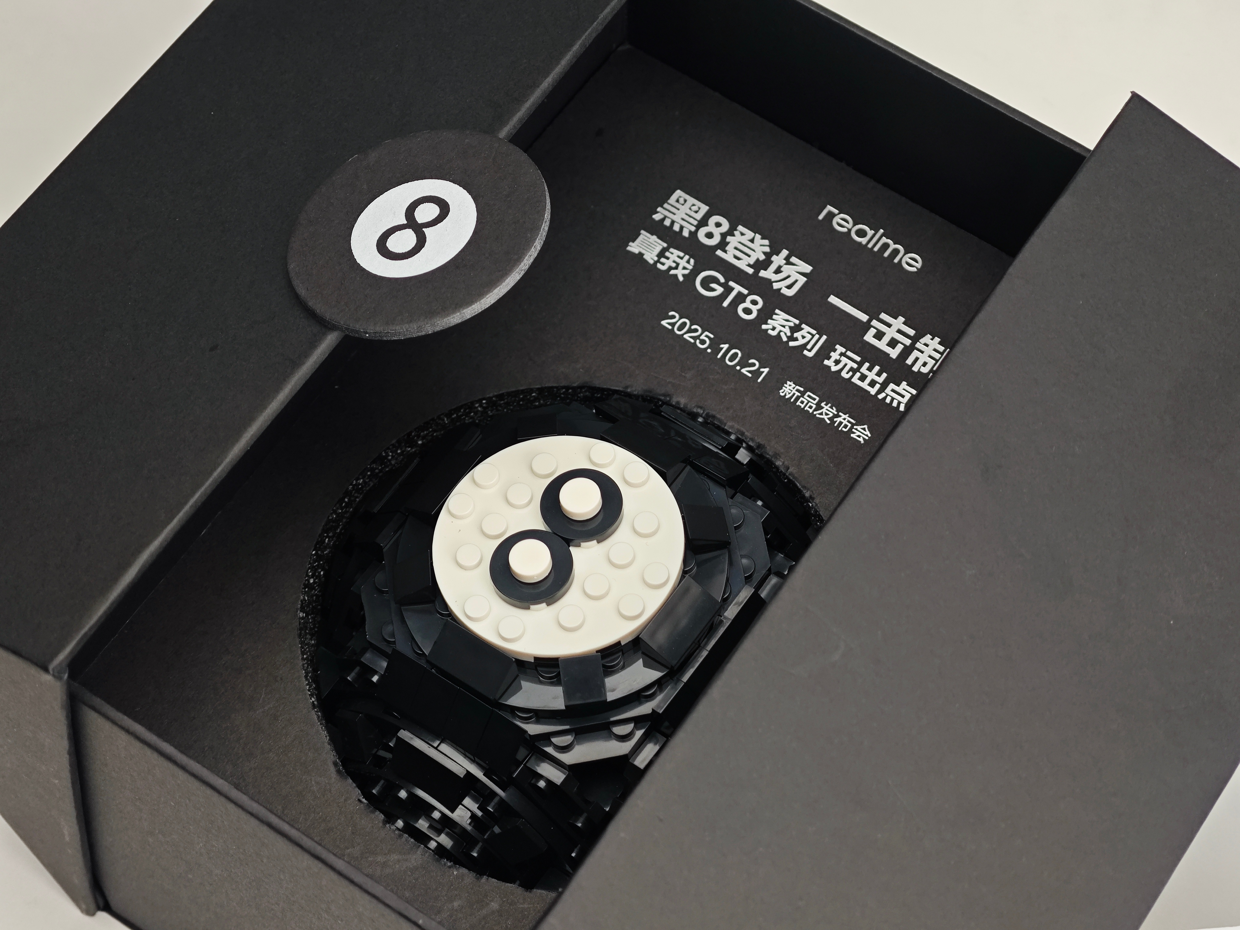 真我GT8Pro邀请函一颗“黑8”积木拿手里比手机还慎重这要摔地上没说明书我可