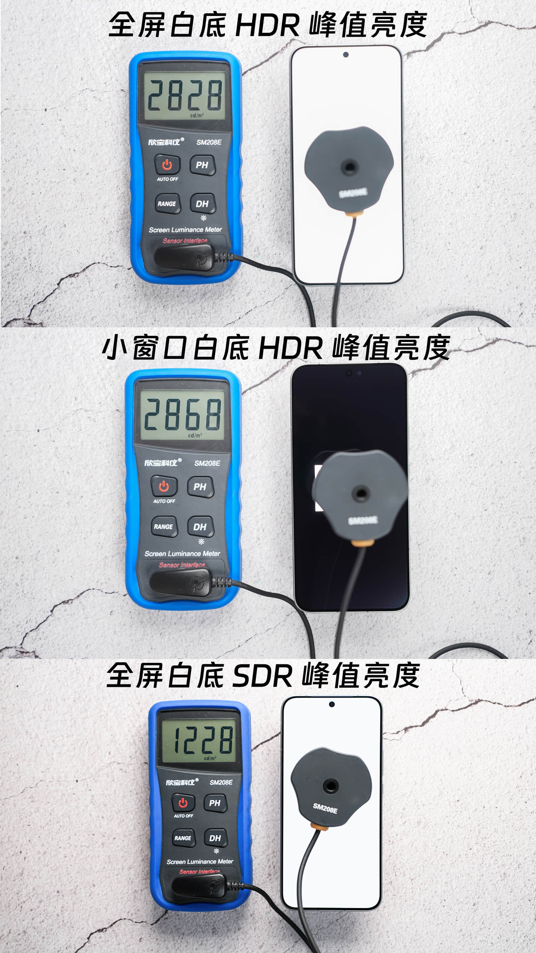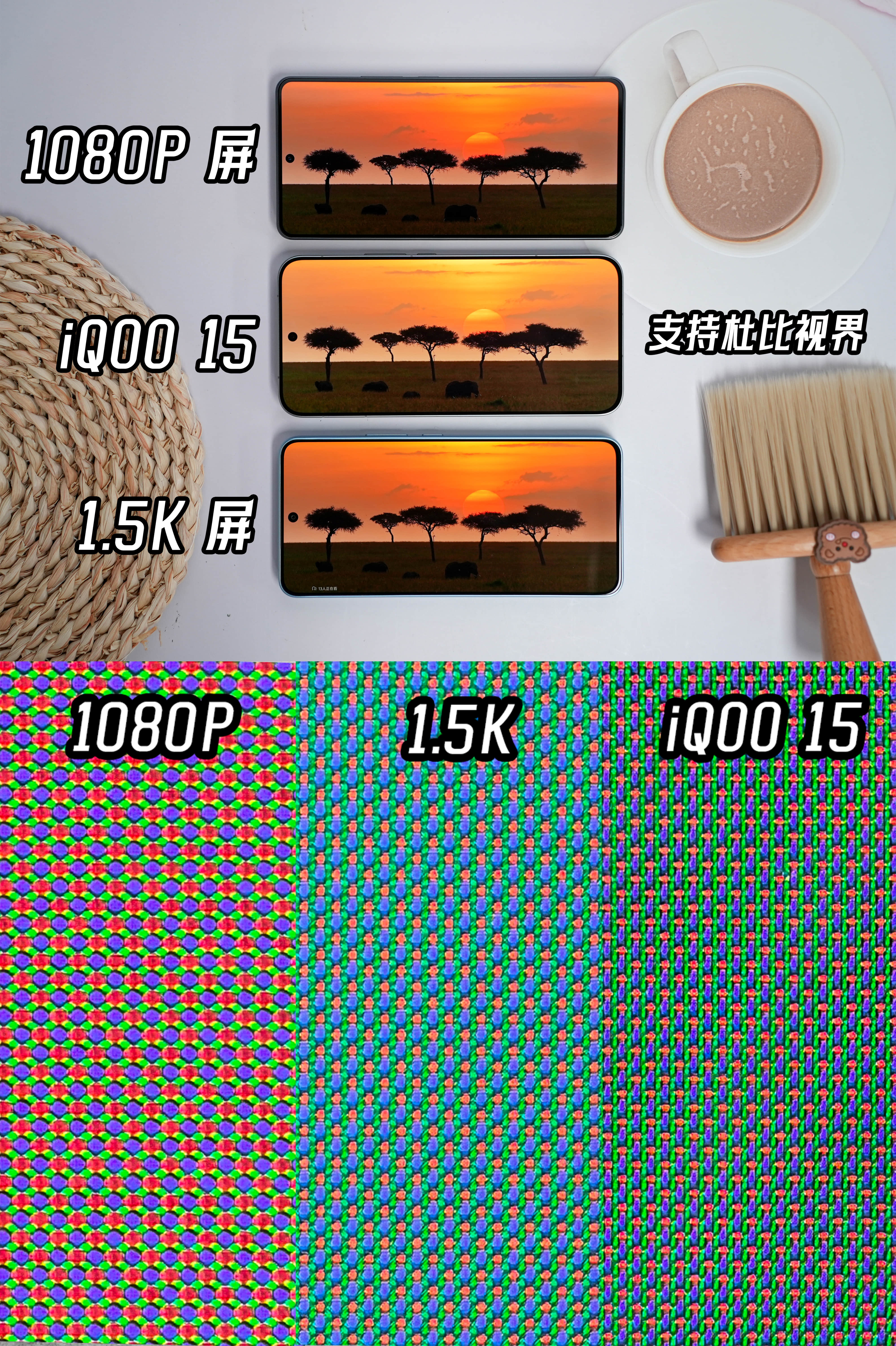 iQOO和三星联合定制的这块屏幕,经过实测,在小窗口和全屏白底HDR的峰值亮度,都很猛,来到了2868 nit,手动白底SDR的亮度也是很给力的(图6)。而且跟1.5K、1080P的屏幕放一起看,iQOO15更加清晰通透,还得是2K屏看得舒服(图7),还有行业唯一的三光敏感应,屏幕亮度能在复杂光线下更自然的变化,这次还支持了全屏AOD(图8),加上优秀的屏幕首帧响应速度,基础体验真的很不错。