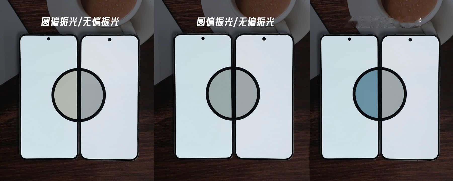 而且这块屏幕是有悦目护眼2.0和莱茵无偏振护眼认证的,它在高、中亮度采用的是DC调光,低亮度是2160Hz高频PWM调光,并且可以在开发者模式中可开启全DC调光,调光策略非常全面,还支持最低1nit显示,采用了无偏振自然光技术,类似自然光的显示效果能更贴合人眼日常感知,减少视觉疲劳更护眼,在偏振镜视角下旋转到不同偏振角度,无偏振光的iQOO 15都不会出现偏色(图9),而且相同亮度下,功耗更低,相同功耗下,亮度更亮。从官方的数据来看,功耗相比上代降低了44%,寿命相比上代更是提升了50%,功耗甚至比iPhone 16 Pro Max的1.5K屏还低40%,结合以上技术升级,它做到了既亮眼、还护眼、又省电、更耐用。