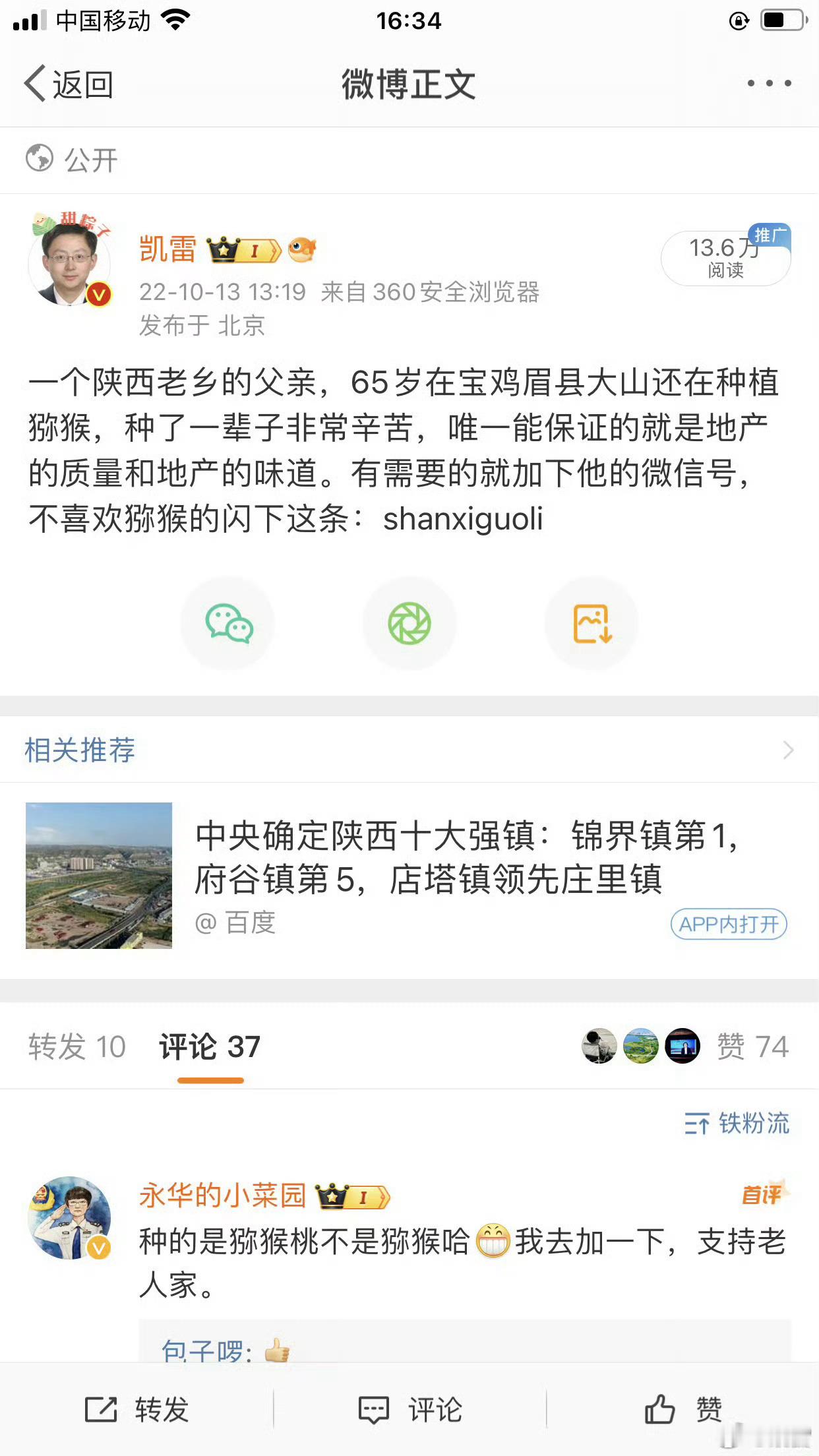 陕西老乡转业到北京,68岁老父亲种的猕猴