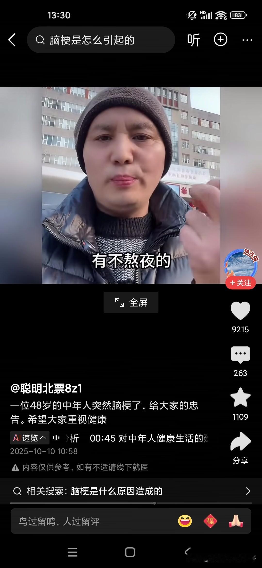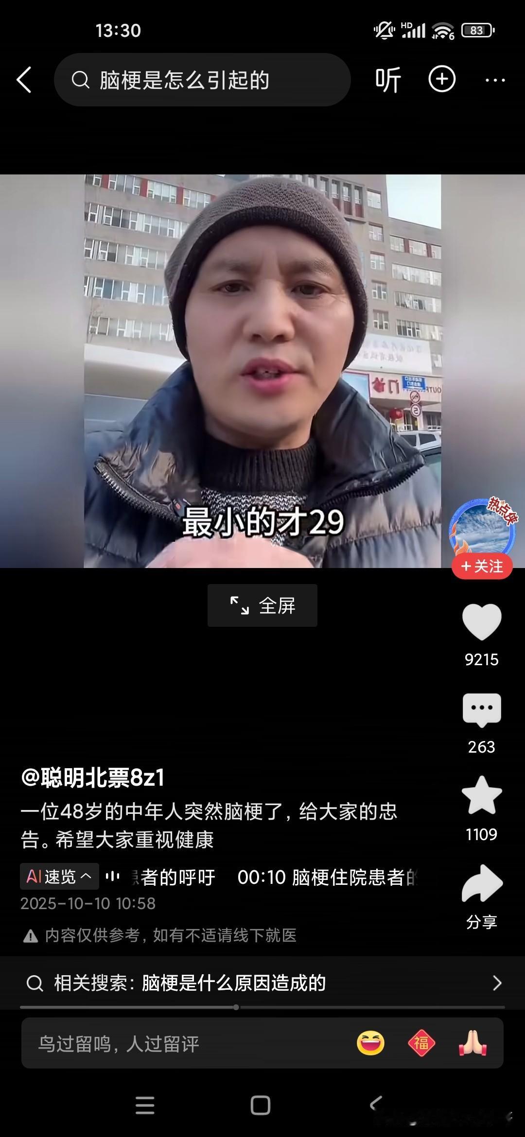 大家一定要对脑梗充满敬畏,千万不要觉得脑梗离自己很远,尤其是独身人士,自己一个人住家里,平常又熬夜又喝酒,又不爱喝水,又抽烟,生活习惯不良,生活作息不规律,而且也又不参加运动锻炼,睡眠严重不足,年年又不去体检,这些人都是高危人群,大家不要觉得这个脑梗似乎只与老年人相关,这位大哥去医院里住了10多天,就发现很多都是50岁以下的,有的甚至最年轻的,只有29岁,这些人有一个共同特点就是不爱喝水,只爱喝饮料,同时的话有贱货,有其他的喝酒,抽烟,情绪不稳定,熬夜打麻将,然后不锻炼或者肥胖等等原因,大家一定要反省自己,爱惜自己,尊重自然规律!