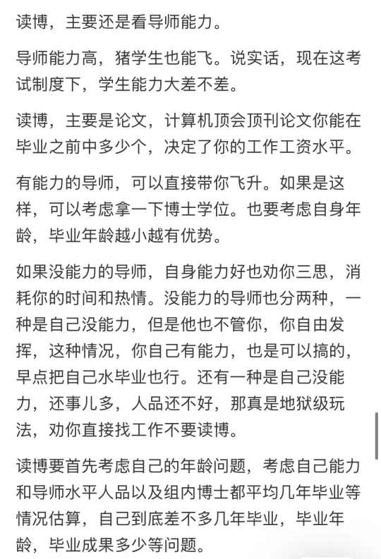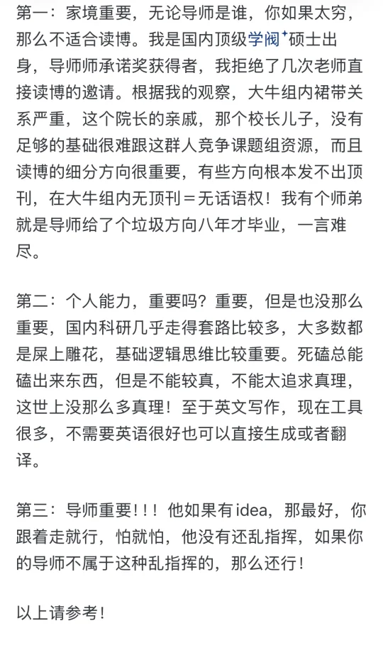 第一:家境重要,无论导师是谁,你如果太穷,那么不适合读博。我是国内顶级学阀*硕士出身,导师师承诺奖获得者,我拒绝了几次老师直接读博的邀请。根据我的观察,大牛组内裙带关系严重,这个院长的亲戚,那个校长儿子,没有足够的基础很难跟这群人竞争课题组资源,而且读博的细分方向很重要,有些方向根本发不出顶刊,在大牛组内无顶刊=无话语权!我有个师弟就是导师给了个垃圾方向八年才毕业,一言难尽。