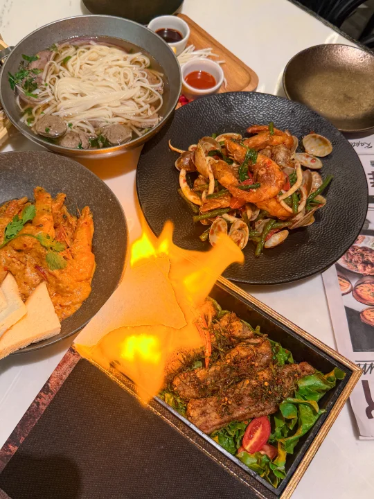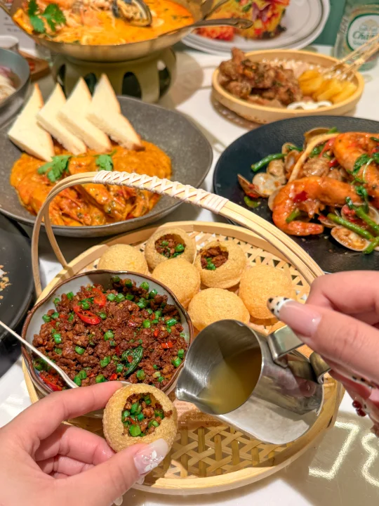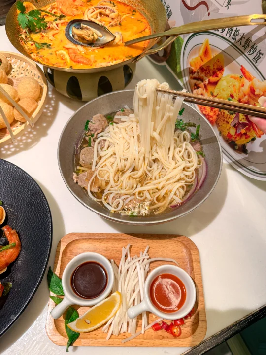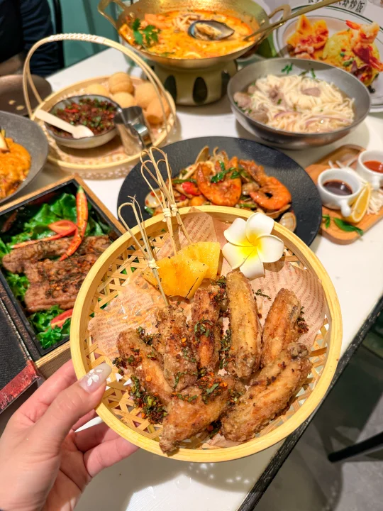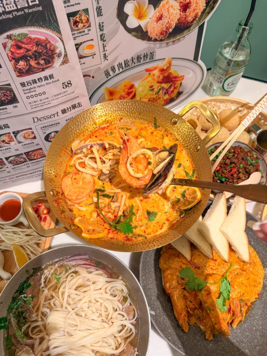 在保定吃的最chill的一餐 南洋菜做的很地道🇸🇬 🍃餐厅装饰清新又高级 拍照的小姐姐不断不断 古法咖喱虾更是神仙菜品🦐 咖喱浓郁醇厚🥥混合着椰香 大虾个头超大,肉质紧实Q弹 连汤汁我都舍不得浪费 真的好爱冬阴功汤啊🥘 汤底浓郁偏酸喝起来很爽口 🐙花蛤八爪鱼鲜虾整碗都是料 🤤吃完好开胃!
