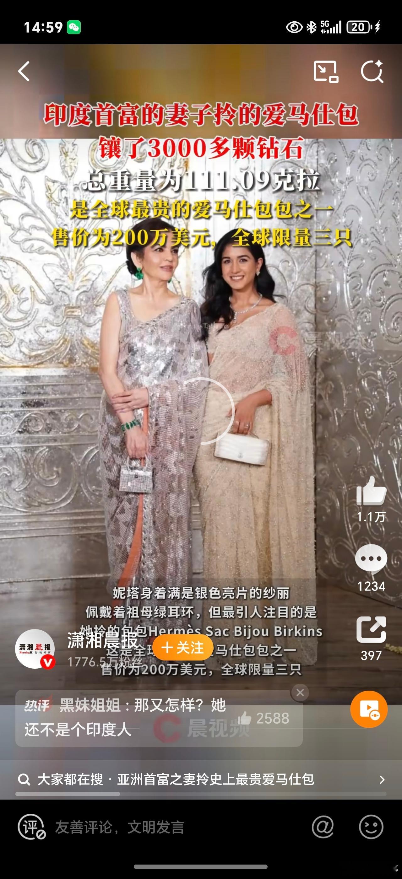 印度首富妻子的爱马仕镶了3025颗钻印度贫富差距超级大啊,镶满钻土是土了点,但有钱也是真有钱[允悲]!