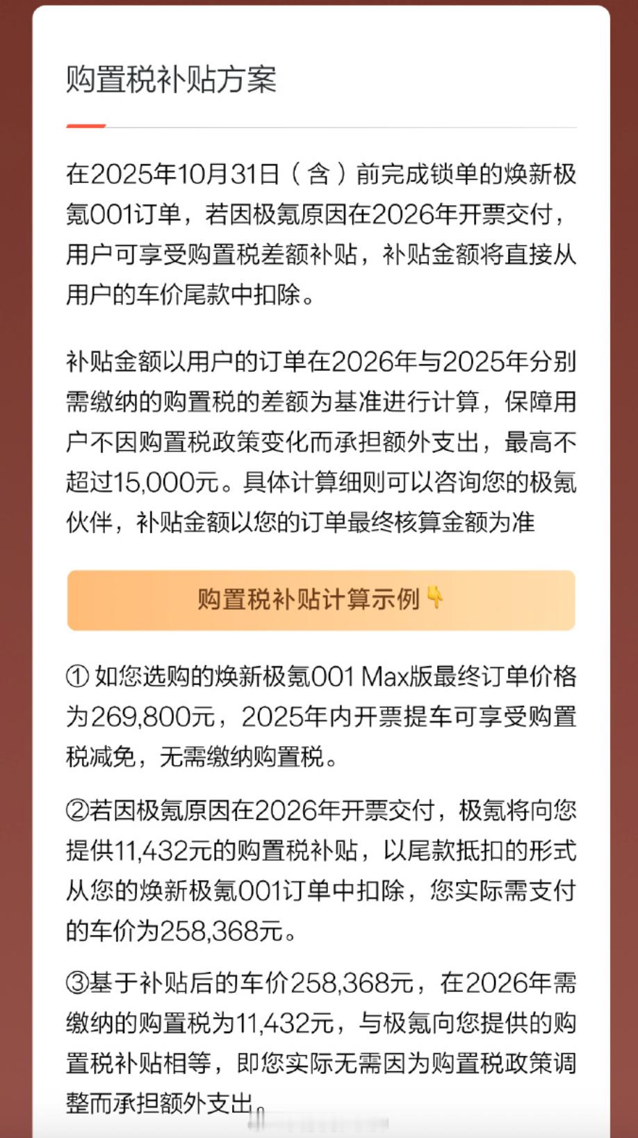 若因极氪原因在 2026 年开票交付, 极氪将向车主提供 11,432 元的购置税补贴。