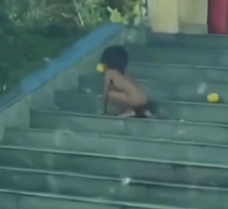 网友拍到孩子赤裸爬行形似野人浑身黢黑头发又长又乱没穿衣服现在多冷