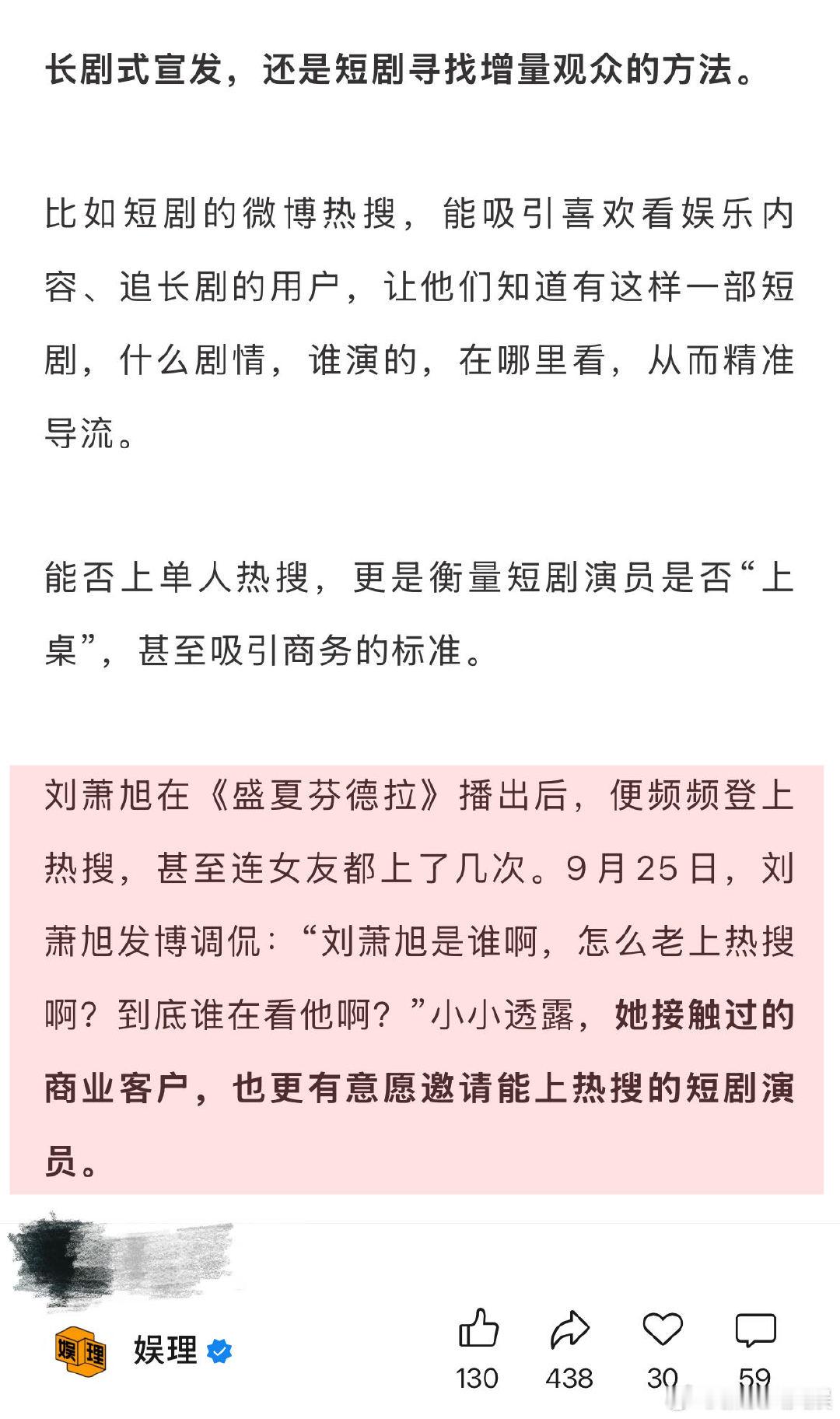 业内谈短剧宣发长剧化 短剧正在复刻长剧的造星模式 长剧式宣发,还是短剧寻找增量观众的方法。能否上单人热搜,更是衡量短剧演员是否“上桌”,甚至吸引商务的标准。刘萧旭在《盛夏芬德拉》播出后,便频频登上热搜,甚至连女友都上了几次。某短剧平台运营透露,她接触过的商业客户,也更有意愿邀请能上热搜的短剧演员…娱理独家↓