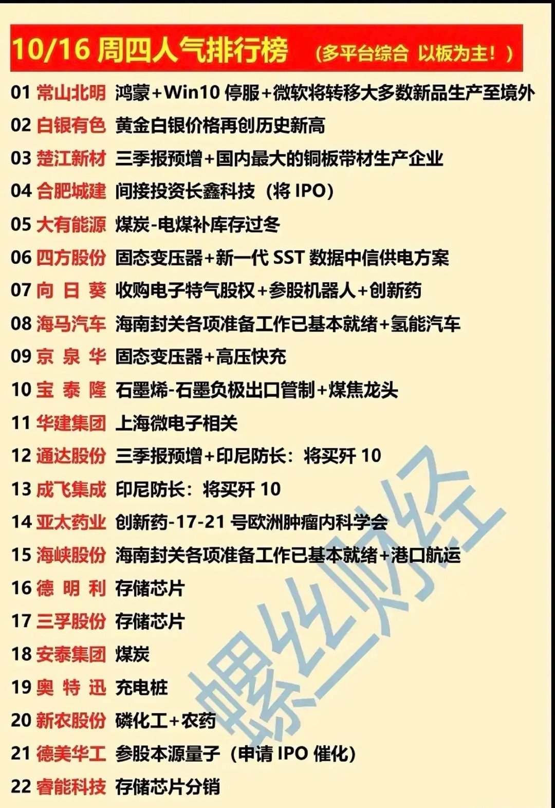 10月16日周四的人气排行榜,涵盖鸿蒙、贵金属、新能源、军工、半导体、煤炭、海南自贸港等热门赛道,驱动逻辑包含政策利好、资源涨价、业绩预增、IPO催化、事件驱动等,反映当日市场对题材热度、业绩确定性、产业趋势的多元关注,资金围绕“政策+业绩+题材”三大主线布局。
