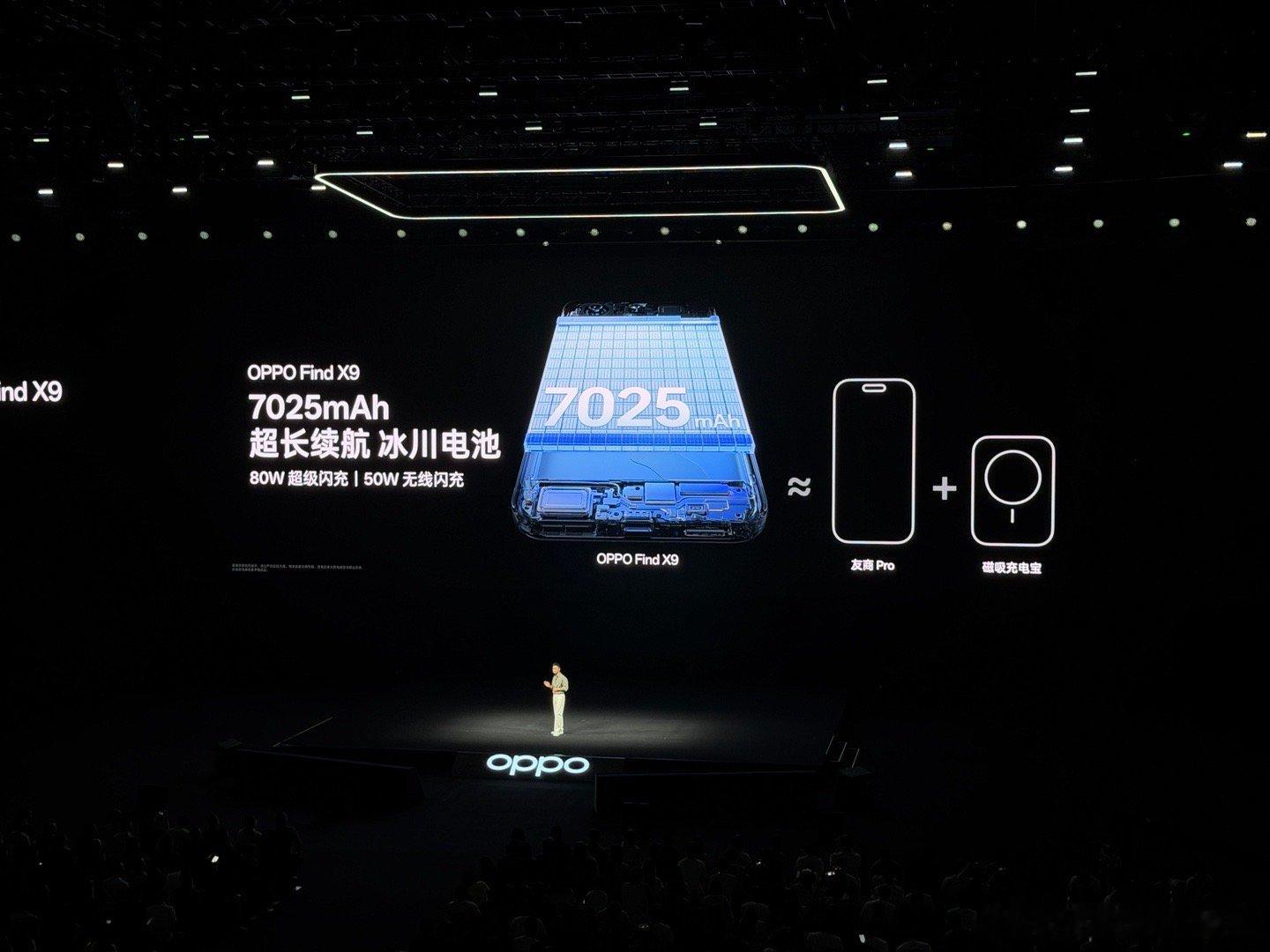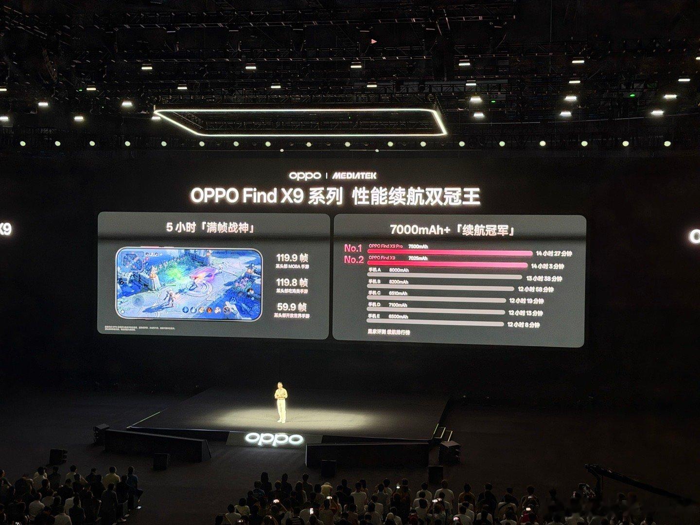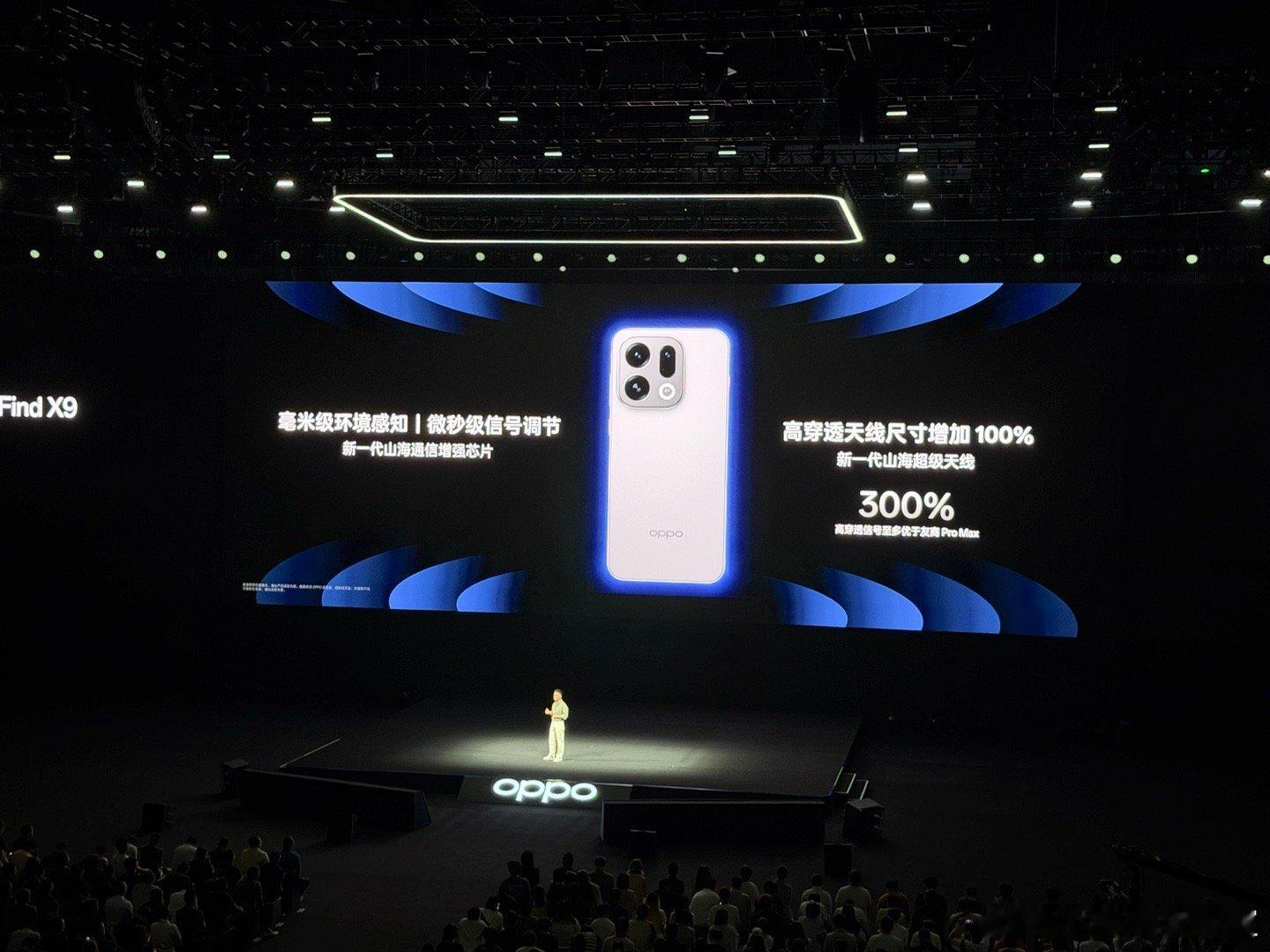 「无 7000,不旗舰」。Find X9 全系搭载 7000+ mAh 超大冰川电池,续航表现全面霸榜,告别充电宝,旅拍尽兴出片;更有山海通信增强芯片强势加持,信号时刻在线。 OPPO发布会