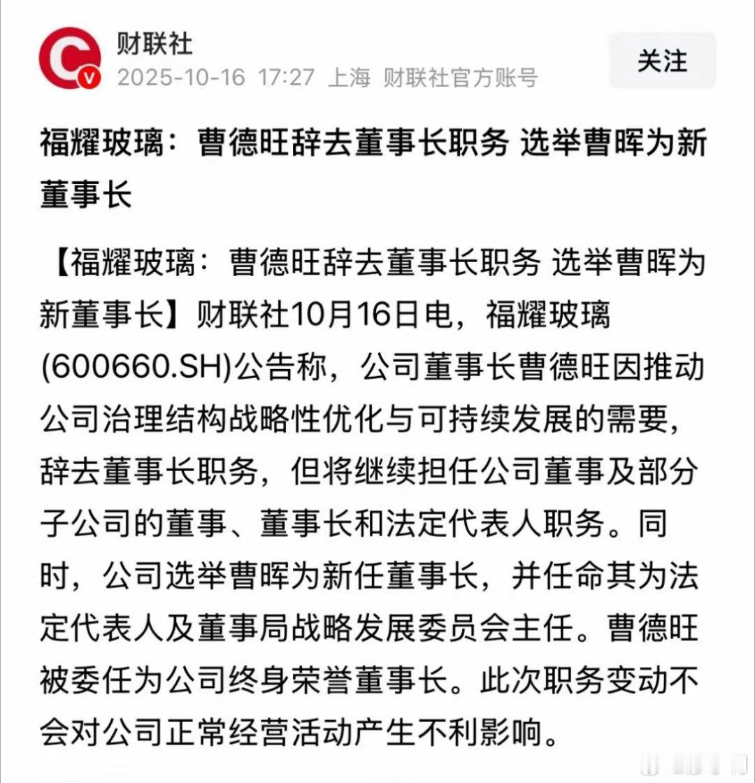 曹德旺辞去福耀玻璃董事长职务曹总的眼光比宗庆后更具前瞻性,他吸取了宗庆后的教训,