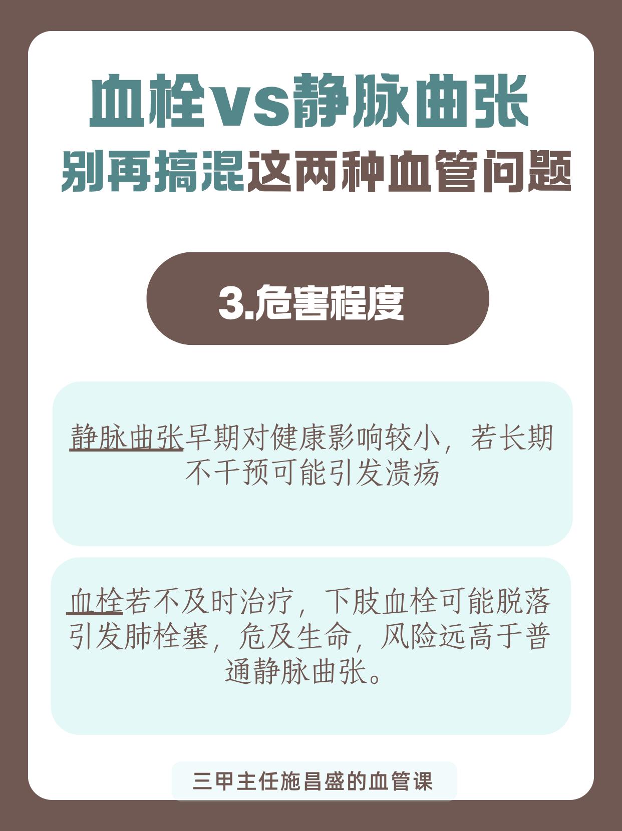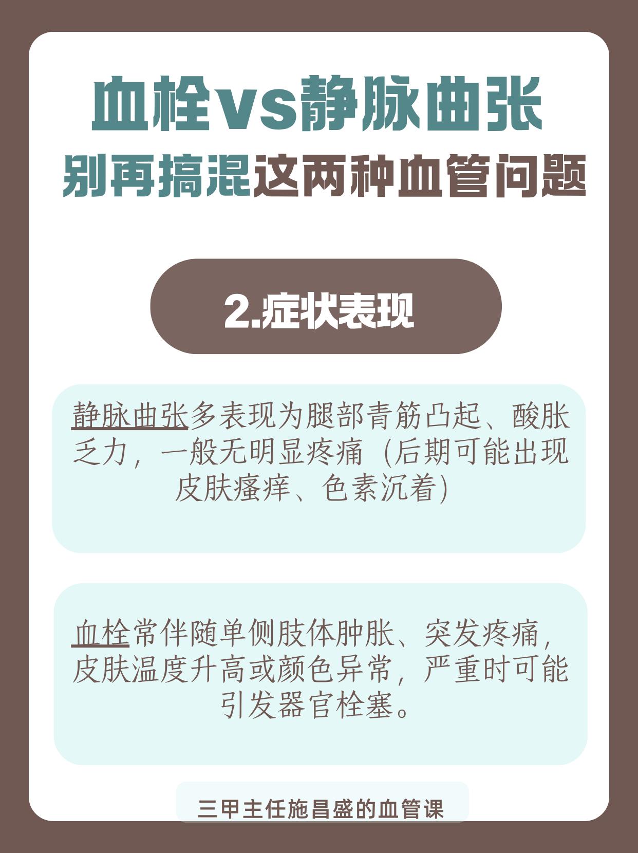 血栓vs静脉曲张:别再搞混这两种血管问题。血栓和静脉曲张常被混淆,实则不同。发病机制上,前者是血液“结块”堵管,后者是瓣膜受损“倒灌”;症状上,前者突发肿痛,后者青筋凸起;危害上,血栓可能致命,静脉曲张多引发溃疡,需仔细区分。