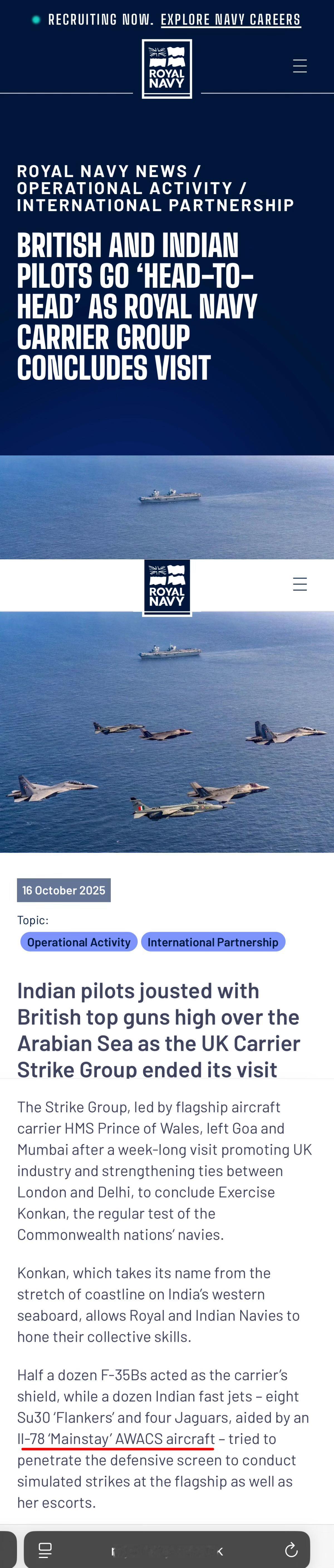“高危行动”中的英印联演F35B、苏30MKI和美洲虎同框献艺,英军需要招懂军事的宣传干事 此次联演除了印度海军,印度空军也凑上来了,英印双方展开了模拟海空攻防演练:英国海空军以6架F35B“闪电”战斗机为防守力量,印度空军8架苏30MKI和4架美洲虎攻击机在1架A50预警机的指挥保障支援下模拟突防。 印度空军那边也官宣其预警机参与联演,然而到了英国海军军宣(图5)那儿,就变成了伊尔78“Mainstay”预警机……众所周知“Mainstay(支柱)”是A50预警机的北约代号,伊尔78是加油机,哪怕用伊尔76这个平台名称也不至于错的这么离谱,还是那句话:“军宣首先得懂军事”。军宣上“RECRUITING NOW(正在招聘)”,嗯,你们确实需要招懂军事的宣传干事。
