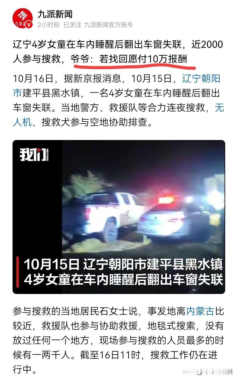 4岁女童走丢一天后,爷爷竟悬赏10万!如果能找回女童,承诺立马兑现。原来,10月15日爷爷奶奶开面包车带着孙女去山上干农活,这才出了意外。 据多家媒体报道,10月15日下午,辽宁有一个4岁小女孩走丢了,因为女孩的父母都在外打工,一直是爷爷奶奶带大大。 当天吃过午饭,中午12:35分左右,爷爷开着面包车,带着奶奶和她到山上干农活,因为女孩当天睡着了,爷爷就把她留在了车上。 车门关着的,车窗打开了一半透气,谁也没想到下午1点多,爷爷去车旁边放东西,顺便看看孙女,这时才发现孙女不见了,车门也没有打开,他们推测可能是打开窗户走的。 车停的地方,离他们干活地只有200米,中间没有阻碍物,一抬头就能看到面包车,可能小女孩当时找爷爷奶奶走错了方向。 发现孙女不见后,爷爷立马通知亲戚上来帮忙寻找,因为爷爷知道,在这个附近有多处断崖,还有老鹰洞,再加上现在夜间温差大,必须尽快找到。 同时,他们还还报了警。 警方兵分多路,一边帮着找人,一边查看各个路口监控,当地已有上百人参与了搜救,只可惜小孩去了哪儿,如今没有一点线索。 孩子的爷爷表示,如果谁带回孩子,愿意支付10万报酬。 家属还发布了寻人启事,上面除了孩子的一些特点外,她说话很清晰,应该很懂事了。 当地参与一名志愿者告诉记者,15日晚上接到通知后立马出发,晚上12点多赶到了现场,因为考虑到晚上下雨,此时的辽宁山里温差大,没有休息就展开了搜寻。 然而,直到10月16日下午13:00分还是没有一点线索,包括村里人说的老鹰洞,他们也去看了,是在一处断崖附近,洞里有老鹰的爪印,但是并没有孩子的踪迹。 4岁女孩,年龄该那么小,她能去哪里?再加上现在辽宁夜里的温度很低了,希望能快速找到孩子吧。 又或者,孩子只是走丢后,被有心人给带回去了,但愿能听到好消息传来吧。 最后,好人一生平安!