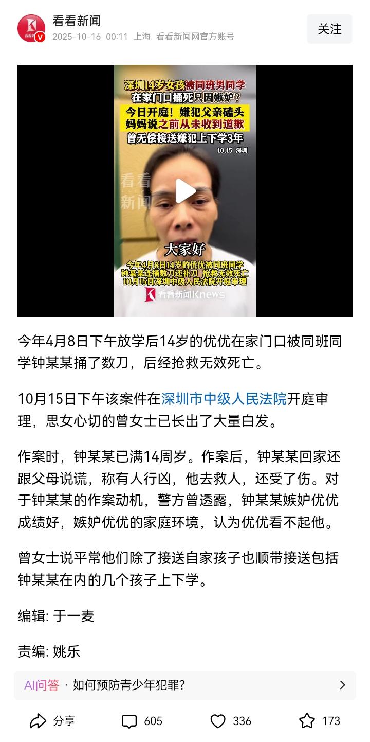 看完深圳优优案庭审,一闭眼就是优优妈妈白发的样子,和她之前笑容明媚的照片对比,我的心像是被揪了一样疼。 谁能想到,那个三年来还帮忙免费接送的同学会恩将仇报,把善良可爱的优优杀害,优优可是独生女啊,让妈妈怎么受得了。 看到钟某某父亲当庭的磕头,我心里也只有一个念头:这头磕得再响,能换回妈妈失去的女儿优优吗,整整26刀,想象不到当时优优有多痛。 警方曾透露,说这孩子是嫉妒优优成绩好、家庭好,觉得自己被看不起了,可他怎么不想想,人家妈妈三年来免费接送他上下学,这份情他不记反而心安理得接受合理吗。 这行为和“农夫与蛇”有什么区别,从小到大书里都有说善良感恩,他这完全是被嫉妒淹没了。 还有一处细节看完让我真的很震惊,这孩子作案后手上有血迹,他居然可以很淡定的回家跟父母撒谎说自己“见义勇为帮助了受伤的同学”,我真的忍不住问他半夜真的睡得着吗,不会有一点愧疚吗。 现在每晚哄女儿睡觉,我都忍不住多抱她一会,谁能想到那个每天坐在自家车里安静沉默的同学,心里藏着这么狠的算计?这也让我明白了:好心帮忙可以,但得有分寸,还得教会孩子分辨谁是真的值得帮,谁是藏着坏心眼的。 只愿优优在另一个世界没有痛苦,也愿所有家长都能教会孩子:善良要有,保护自己的铠甲更不能少。