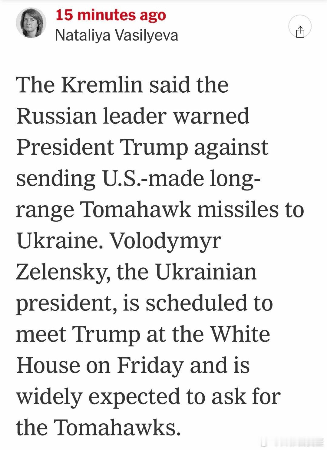 克宫确认了这一消息,并称:Putin在电话里警告Trump“不要给乌克兰提供战斧导弹”