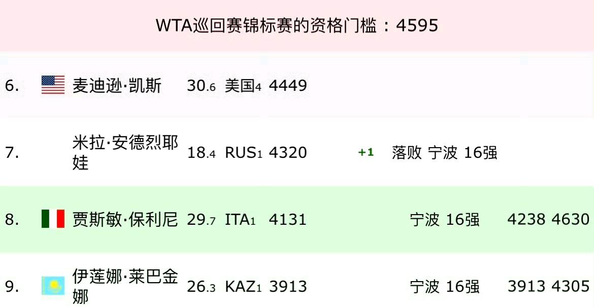 随着莱巴金娜2-1击败雅思晋级宁波赛八强,年终总决赛名额之争越来越激烈。 小米辣爆冷输给朱琳,无缘锁定年终总决赛名额,保利尼、莱巴金娜都已晋级八强。 如果八强战莱巴金娜、保总都晋级四强,两人将直接对话,胜者将拿到一个年终总决赛名额。 冠军积分:小米辣4320、保总4131、莱巴金娜3913。