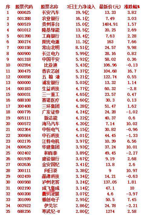 10月17日,前3天主力大幅买入的35名单! 长安汽车:近3日主力净流入19.