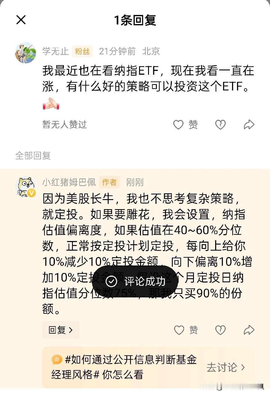 回答一位朋友关于纳指投资的策略,分享给大家: 因为美股长牛,我也不思考复杂策略,就定投。如果要雕花,我会设置,纳指估值偏离度,如果估值在40~60%分位数,正常按定投计划定投,估值每向上偏离10%减少10%定投金额,向下偏离10%增加10%定投金额。假设这个月定投日纳指估值分位数75%,那我只买90%的份额。 简单说,最好的食材只要最简单的烹饪手法,几乎最牛的指数也是一样[大金牙][大金牙][大金牙]
