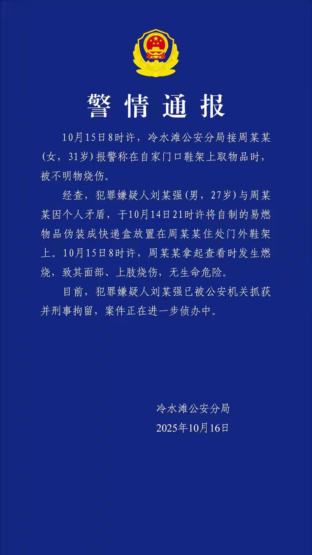 后背发凉!一个“快递盒”,让她全身烧伤! 10月16日,湖南警方通报了一起案件:一名男子把易燃物品伪装成快递盒,导致一名女子在取件时被严重烧伤。谁能想到,一个看起来普普通通的包裹,竟然成了毁容又伤身的陷阱? 据调查,嫌疑人花了心思做伪装,把危险物品包装成日常快递,利用“送货上门”的方式接近受害者。女子在拆快递的瞬间遭遇爆燃,四肢和脸部多处烧伤,目前还在医院接受治疗。警方已经迅速抓到了嫌疑人,但悲剧已经发生,无法挽回。 悲剧提醒每一个人—— 1.对陌生包裹要多个心眼:特别是自己没买过、也查不到来源的快递,一定要先确认清楚; 2.小区安全管理要跟上:物业应该规范快递存放点,不能让可疑包裹随便送进来; 3.感情纠纷别走极端:初步调查显示两人之间有矛盾,但再大的冲突也不能用暴力解决! 💬 网友怎么说 “太可怕了,现在连收快递都得提心吊胆了吗?” “一定要严惩!这种伪装成日常用品的伤害,真的防不胜防。” 一次恶念,毁掉的是两个家庭。生活中那些看起来“平常”的瞬间,也可能藏着危险。 多一分警惕,少一分侥幸,希望我们每个人:如果收到可疑快递,可以先联系快递公司核实单号,或者报警处理,千万不要自己随便打开!