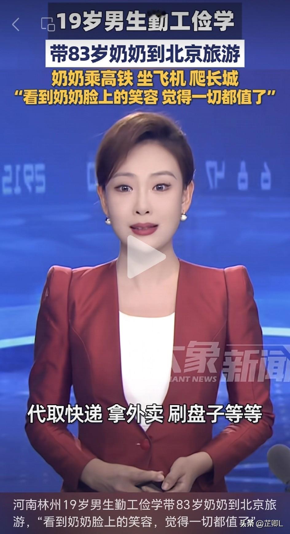 19岁,3份兼职,只为83岁的奶奶和一场圆梦北京的旅行!和金钱相比,成全孩子的孝心更重要! 近日,河南林州一名19岁的男大学生带83岁奶奶游北京城的视频,在网络上悄然走火。 19岁的大一男生,奶奶因为一辈子没去过北京,成了她的终生遗憾。已经83岁高龄的奶奶,未来的岁月,每一天都显得弥足珍贵。 但父亲残疾没有收入,母亲需要照顾父亲也走不开。 心地善良又孝顺的男生,用自己攒了7个月的勤工俭学钱,帮奶奶圆梦! 男生在课余时间做三份兼职,在餐厅打杂一天工资10块钱,帮同学拿外卖、快递一次一块钱,还在图书馆帮老师整理书籍,7个月攒了近3000元。 男生说,“看到奶奶的笑容那一刻,觉着一切都值了!奶奶开心,我就开心了!” 这一定是一个被奶奶用心呵护着长大的乖孙! 看着男生阳光的笑脸,和奶奶满脸的慈祥和满足,网友们纷纷为19岁的大男孩点赞: “为好孩子点赞!” “中华好少年,传扬传统美德!” “不管你成绩如何,你的知行合一已经满分了!” “年轻人的榜样啊!” “好孩子真难得,愿你毕业以后一路长虹!” “这样的孩子,无论未来干什么,都不会差!” “点赞!好孩子做了很多大人都没有做到的事!” “懂得感恩的孩子,既暖心又让人心疼。” 也有网友说,奶奶不知道心疼孙子挣钱不容易,要是自己肯定不去! 也有人说,全国都找不到几个这样孝顺的孩子。 其实,孝顺的孩子很多,奶奶也不是不心疼孙子挣钱不易,而是成全孙子的孝心,远比省点钱意义更大。 现在整体国民生活水平已经改善了很多很多,再也不是以前那种吃了上顿没下顿的苦日子。 所以,孩子们的生活对比长辈,要优渥很多。平常看上去,他们没心没肺的,貌似不懂得孝顺,很多时候,其实是长辈不给他们机会表达自己的孝心。 我家小子今年的暑假,自己找了间科技公司实习。 第一个月只有5天的工资,给我和他爸发了红包。 第二月工资到手的时候,趁着周末两天回来看我们,给我买了一条漂亮彩绳串起一个黄金豆的手链,给爸爸买了个品牌剃须刀。 五、六千的工资,这一下就干进去不少,我都觉着挺心疼的。孩子挣钱不容易,天天写代码,每一分钱都是一个个代码敲出来的。 但回应孩子孝心最好的方式,就是大大方方、欢天喜地地接受了孩子的礼物。 让孩子亲手帮我戴上手链,爸爸赶紧用剃须刀剃了剃还没长出来的胡须,彩虹屁立马跟上,对儿子一顿猛夸,毫不吝啬的拥抱必须是标配。 儿子的笑就没断过,情绪价值拉满! 孩子表达出的孝心,被父母热烈回应,他才会觉着自己表达的爱心、孝心有意义,才会鼓励他以后继续对父母进行爱的输出。 如果你的孩子对长辈没孝心,首先可能是你自己言传身教的结果。其次,大概是你从来没有正确回应过孩子的爱意表达。 为这位勤工俭学带奶奶游北京城的小伙子点赞!也为无数个带着长辈圆梦的年轻人点赞! 更为言传身教,教会孩子礼义廉耻、尊老爱幼的父母们点赞!为懂得回应孩子的每一位长辈点赞! 钱,花了可以再挣!但孩子的爱心被忽视一次,就会减少一分! 信息来源于大象新闻,侵联删!