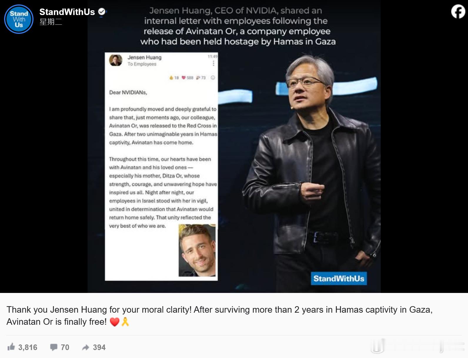 【英伟达工程师被哈马斯囚禁738天终获释 黄仁勋发文:欢迎回家!同事笑称“你的股