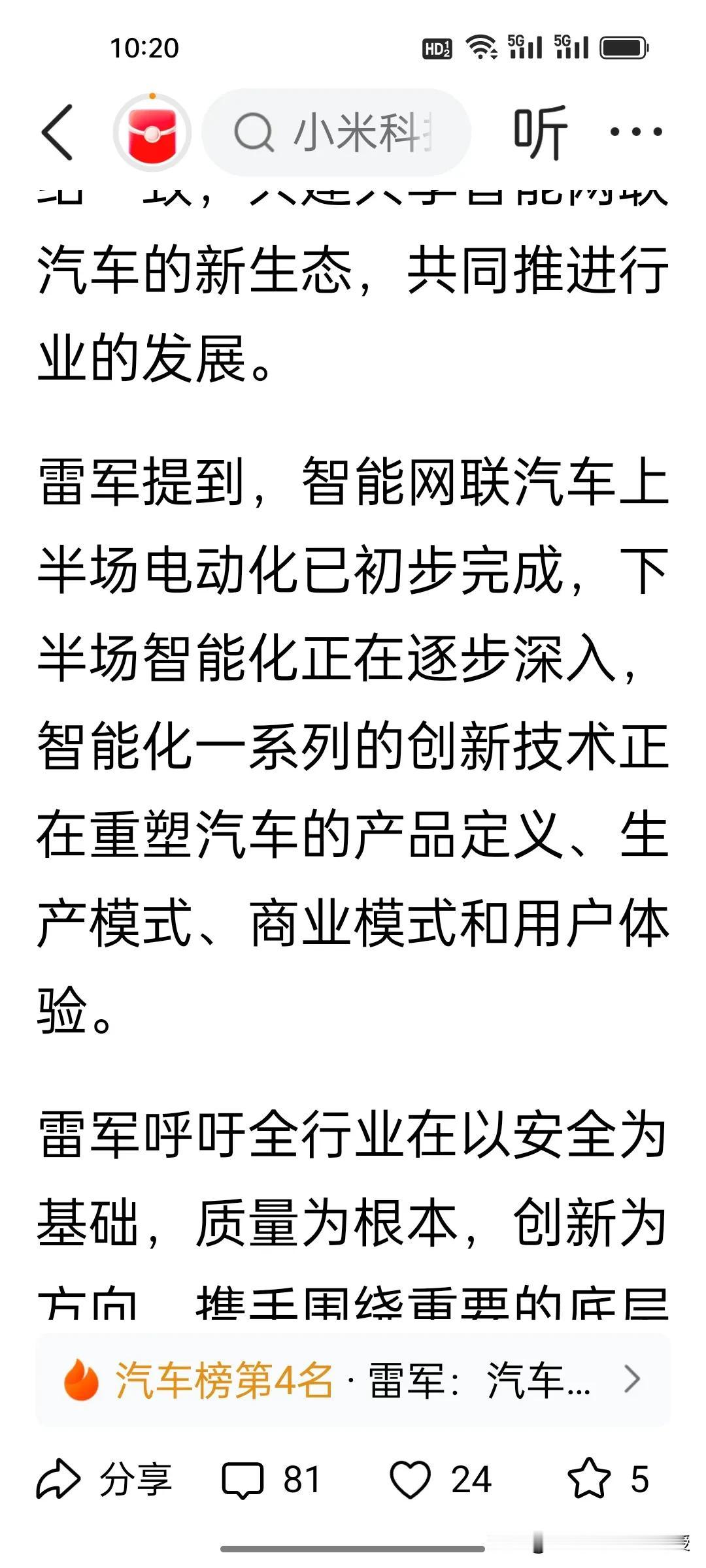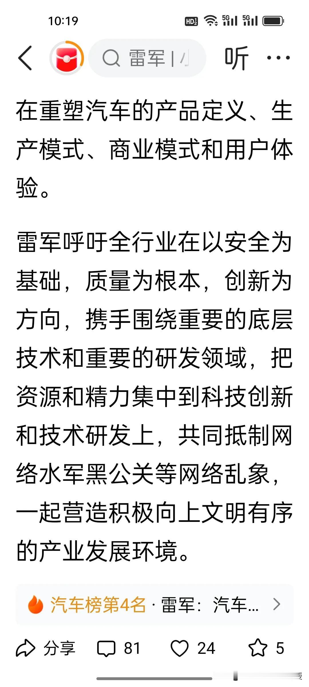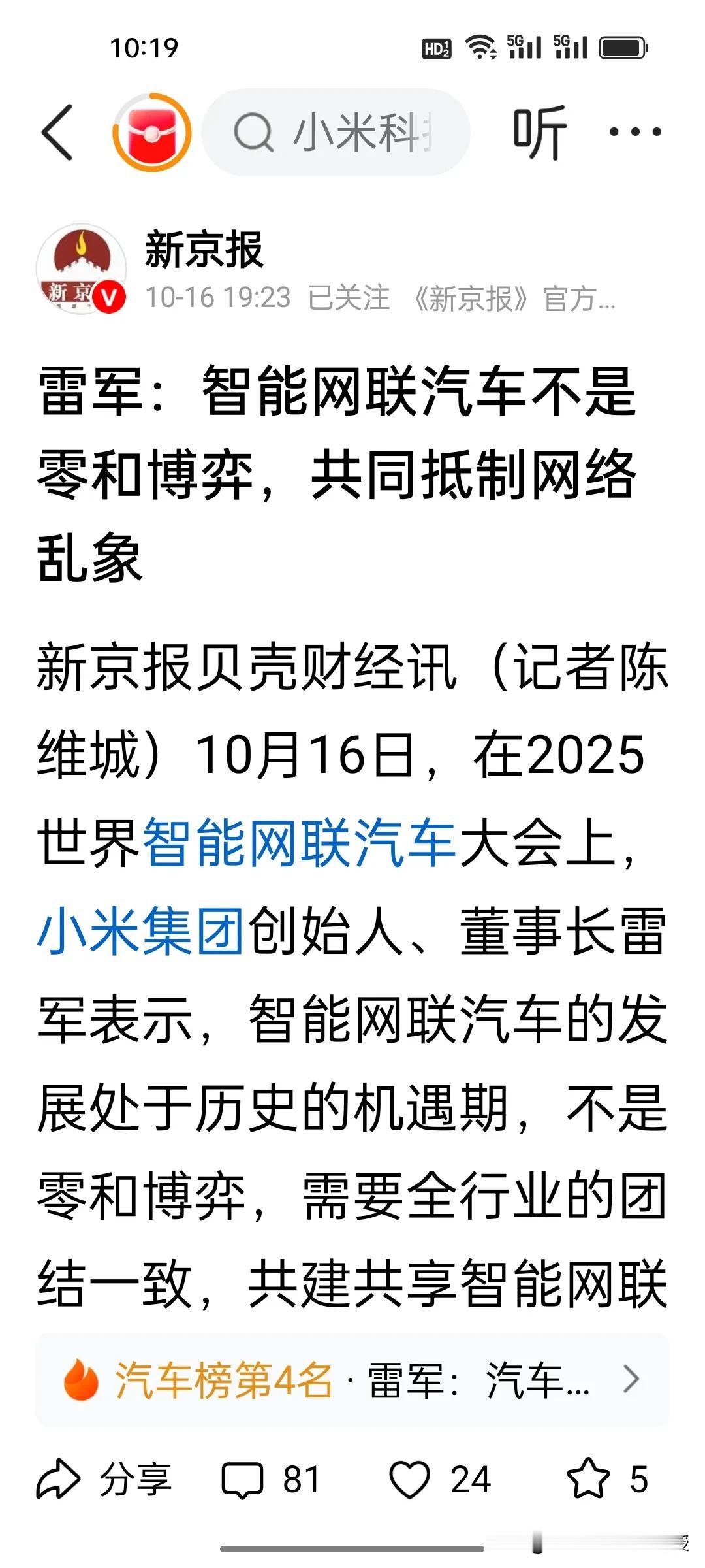 昨天,雷军参加世界智能网联汽车大会上坦诚地讲了一番“心里苦”的真心话,引来无数网友热议!他认为要全行业团结一致,不是零和博弈,要抵制网络水军黑公关。以安全为基础,质量为根本,创新为方向。 小米太火,又造手机,又造空调,还造汽车,各路竞争对手为了市场黑小米的很多,雷军确实天天都要面对黑粉,当然也有像董明珠这样公开说小米的。 雷军有一句话说的对,就是行业不要零和博弈,要抱团发展。比如,现在京东,广汽,宁德时代这种三方发挥长板共赢的合作模式,以及各造车新势力都跟华为合作智能驾驶领域,这种做法就非常值得提倡。 当然,多方共赢的前提是自家产品质量过硬。各行各业确实应该抱团,不应该“有我没你”,而是应该取其长处深耕,方能使这个行业行稳致远。