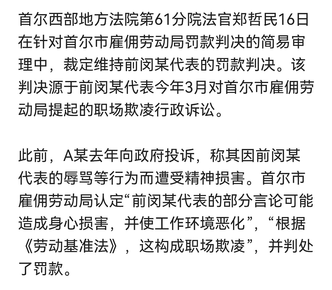 法院承认闵熙珍欺凌 “职场欺凌”…闵熙珍败诉罚款。法院承认:前ador代表闵熙珍确实对职员进行了职场内的欺凌。