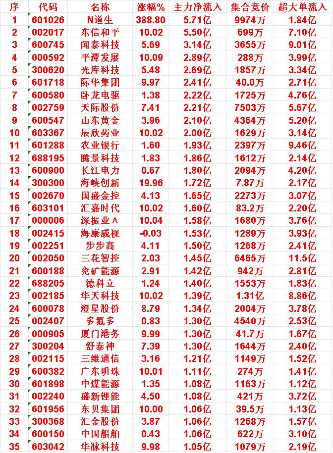 10月17日上午盘,主力趁低位,大幅买入的35名单: N道生:涨幅388.80
