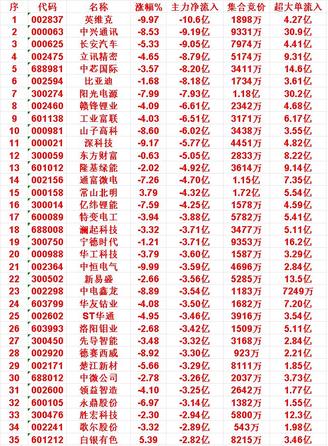 10月17日上午盘,主力趁低位,大幅买入的35名单: N道生:涨幅388.80%,主力净流入5.71亿元。 东信和平:涨幅10.02%,主力净流入5.50亿元。 闻泰科技:涨幅5.69%,主力净流入3.14亿元。 平潭发展:涨幅10.09%,主力净流入2.89亿元。 光库科技:涨幅5.48%,主力净流入2.69亿元。 10月17日中午收盘,主力资金“大幅卖出”的35名单: 英维克:跌幅9.97%,主力净流出10.6亿元。 中兴通讯:跌幅8.53%,主力净流出9.19亿元。 长安汽车:跌幅5.33%,主力净流出9.05亿元。 立讯精密:跌幅4.65%,主力净流出8.79亿元。 中芯国际:跌幅3.57%,主力净流出8.20亿元。