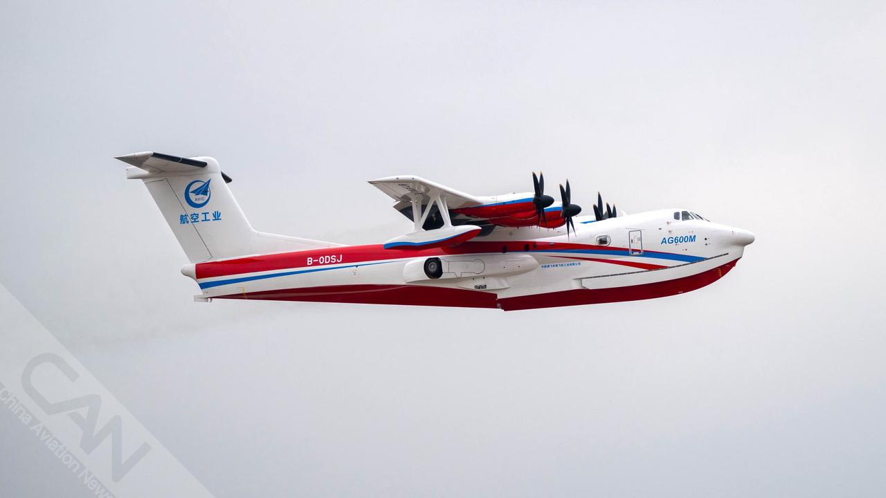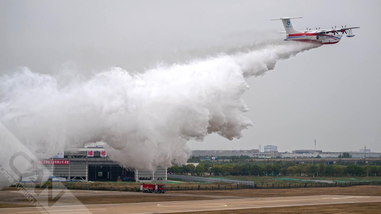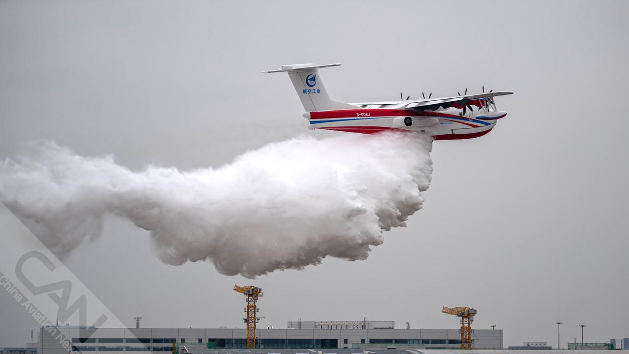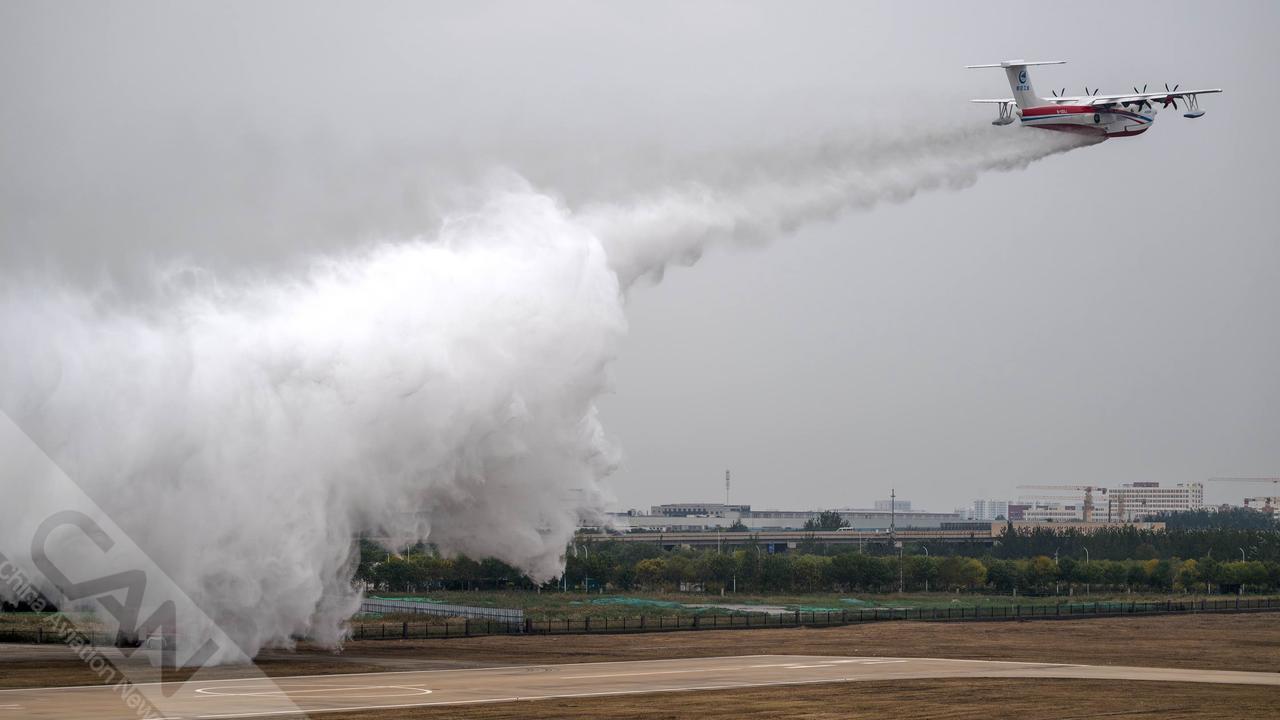 AG600在天津直博会现场进行投水表演,12吨水从天而降、精准倾泻,震撼全场。(