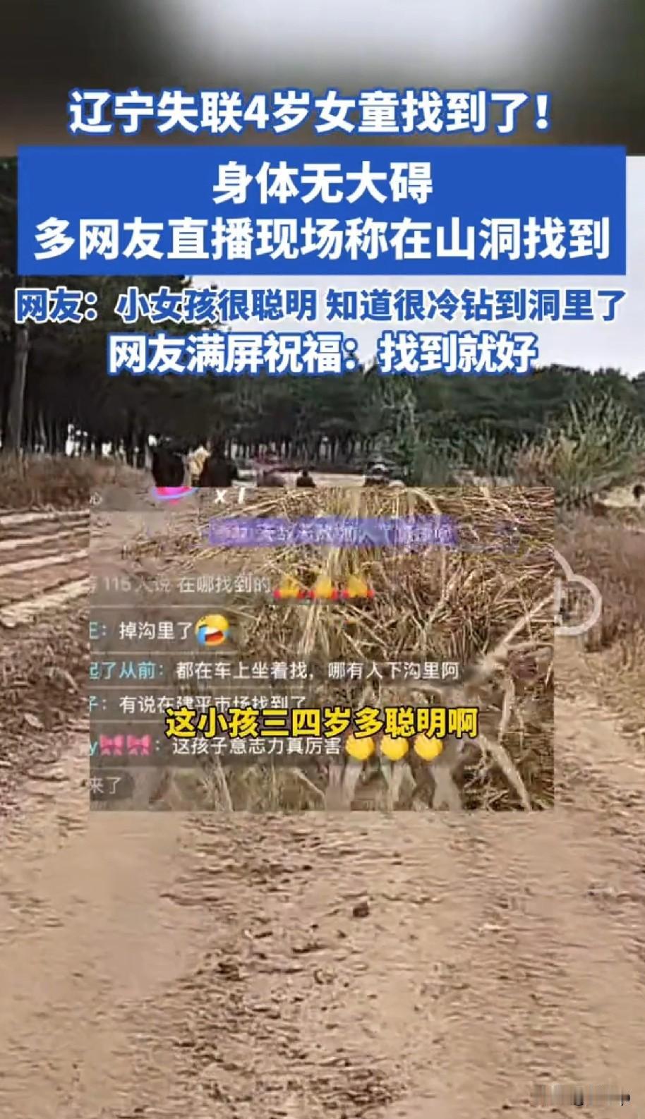 辽宁走失的四岁孩子找到了 人没事,很多说是在山洞里找到的 现在东北的天已经冷了,找到就好 这场搜救发动了2000多社会爱心人士 她爷爷奶奶悬着的心也放下了,真是感谢大家,听说周边省的好心人也自发组织过来找人,有黑龙江和吉林还有内蒙古的,真是太团结了,估计以后爷爷奶奶会看护好孩子,再也不敢放松警惕了。