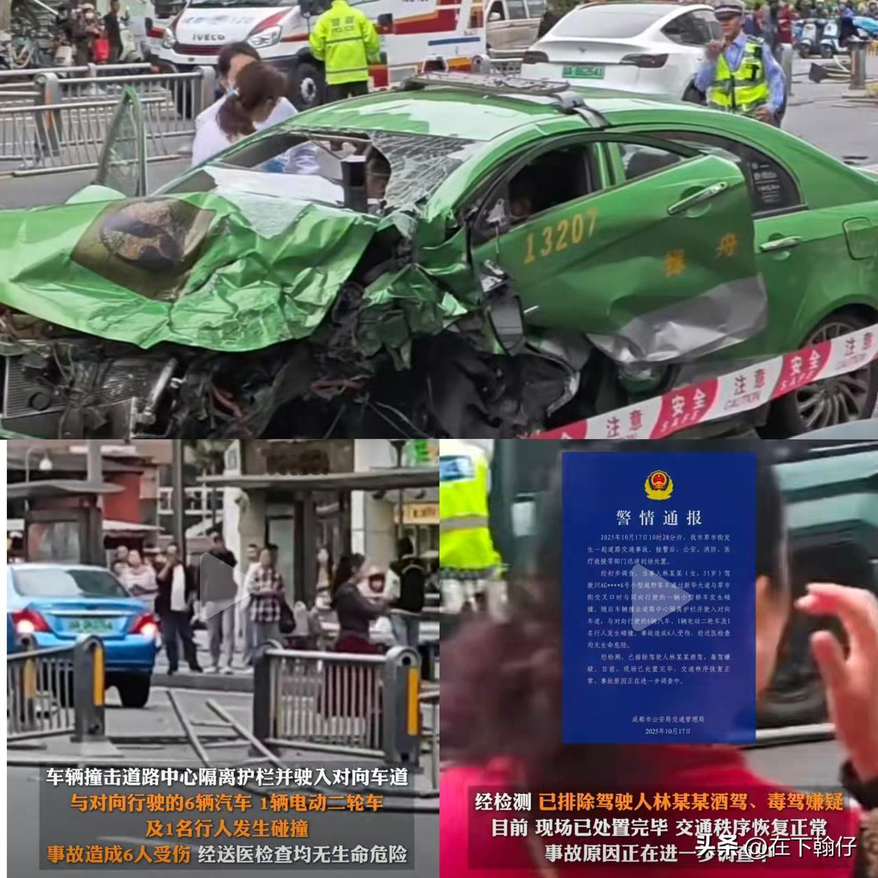 10月17日成都草市街发生惊险一幕,一辆越野车如脱缰野马冲入对向车道,现场碎片满地。 据成都警方通报,10月17日,51岁女司机林某某驾驶越野车在草市街先与同向轿车发生碰撞,随后车辆失控,冲撞中心隔离护栏后闯入对向车道,连续撞击6辆汽车、1辆电动车及1名行人。 事故造成6人受伤,万幸的是所有伤者送医后均无生命危险。经检测,已排除林某某酒驾、毒驾嫌疑。目前事故原因仍在深入调查中。 公布的现场视频可见: · 涉事越野车车头严重变形,几乎报废 · 多辆轿车侧面被撞凹陷,受损严重 · 隔离护栏被撞毁,散落一地 · 地面遍布车辆碎片,一片狼藉 从车辆损毁程度推测,事发时车速应该不慢。开车还是要专注驾驶,拒绝分心,时刻关注路况,容不得半点马虎。