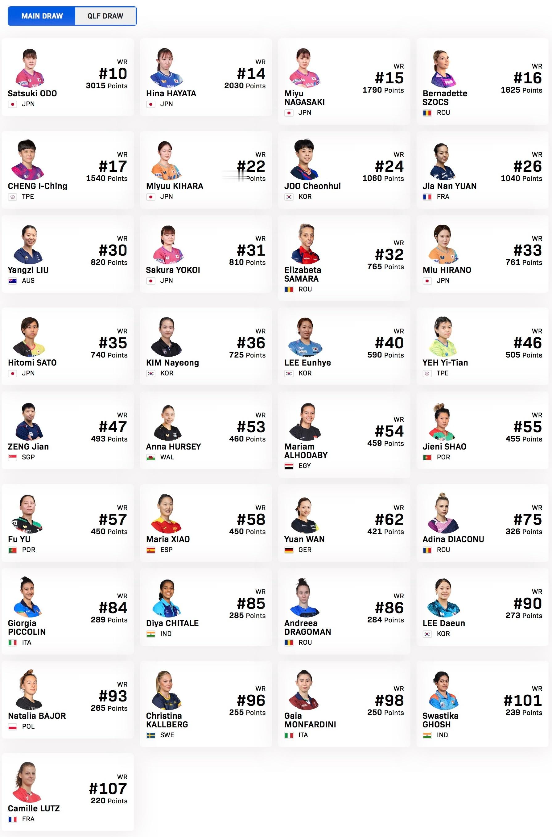 刘杨子🇦🇺,横井咲樱🇯🇵,萨马拉🇷🇴,平野美宇🇯🇵,